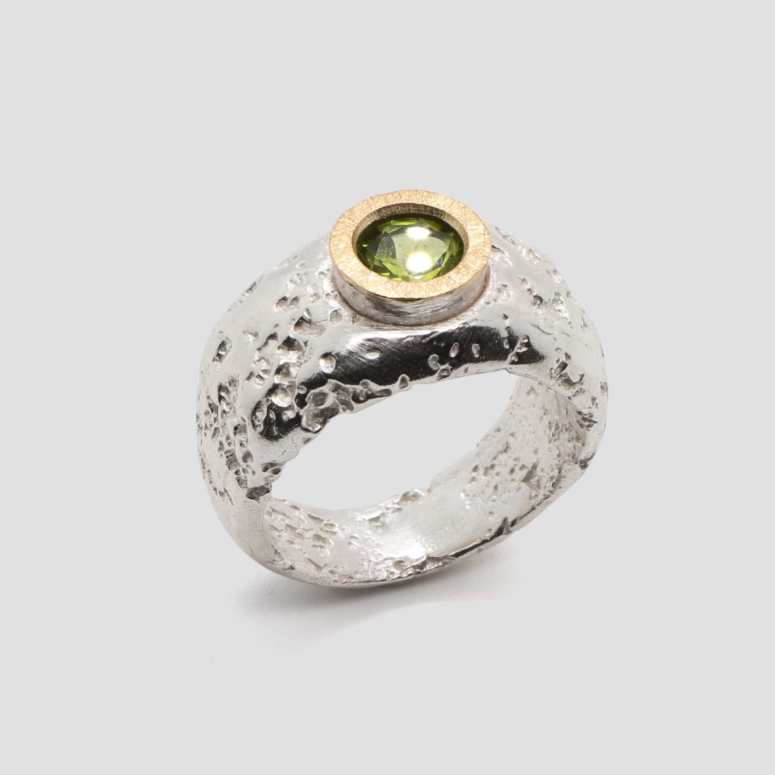 Anillo de plata, oro amarillo de 18k y un peridoto de la China.