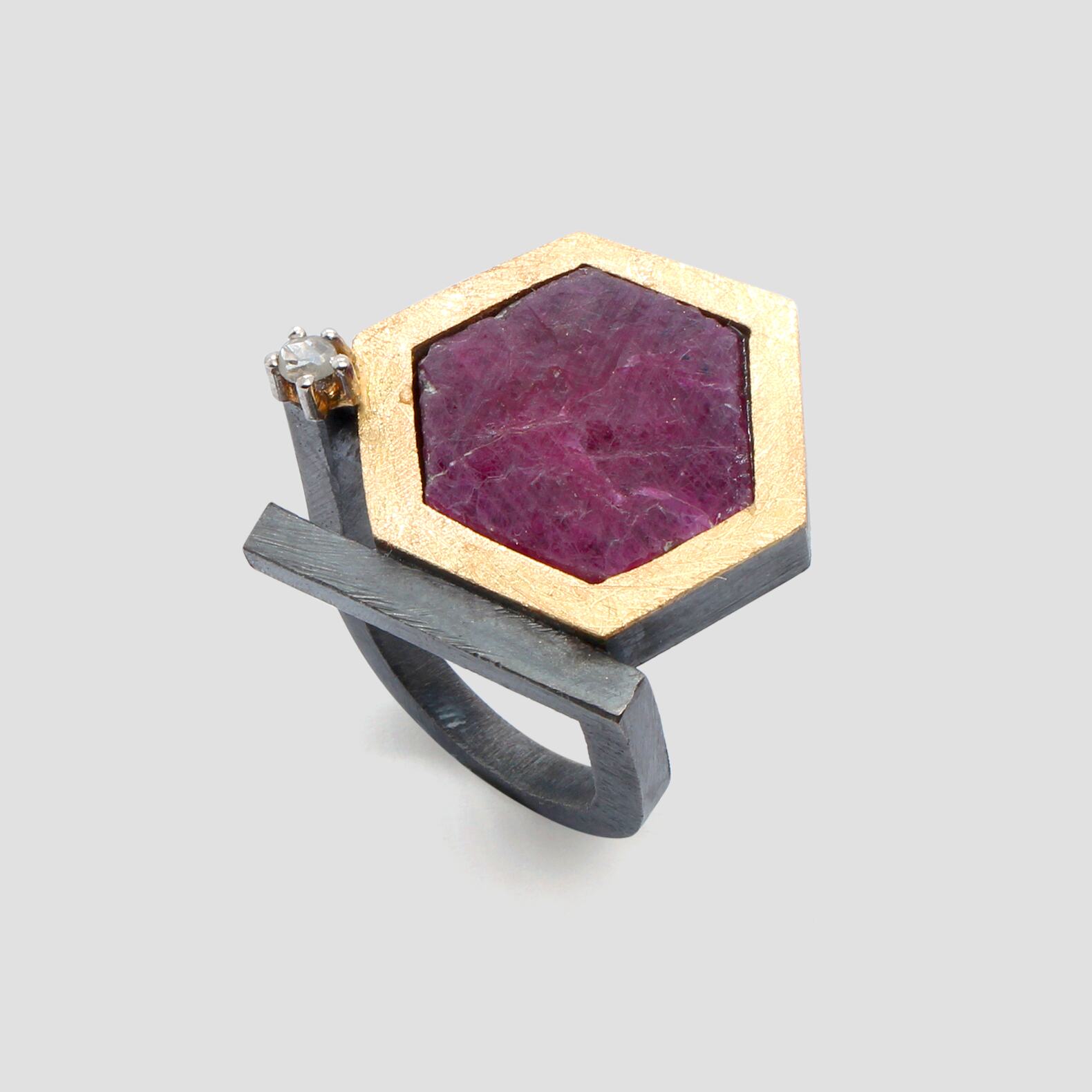 Anillo de plata, oro amarillo de 18k, un rubí y un diamante natural talla antigua.