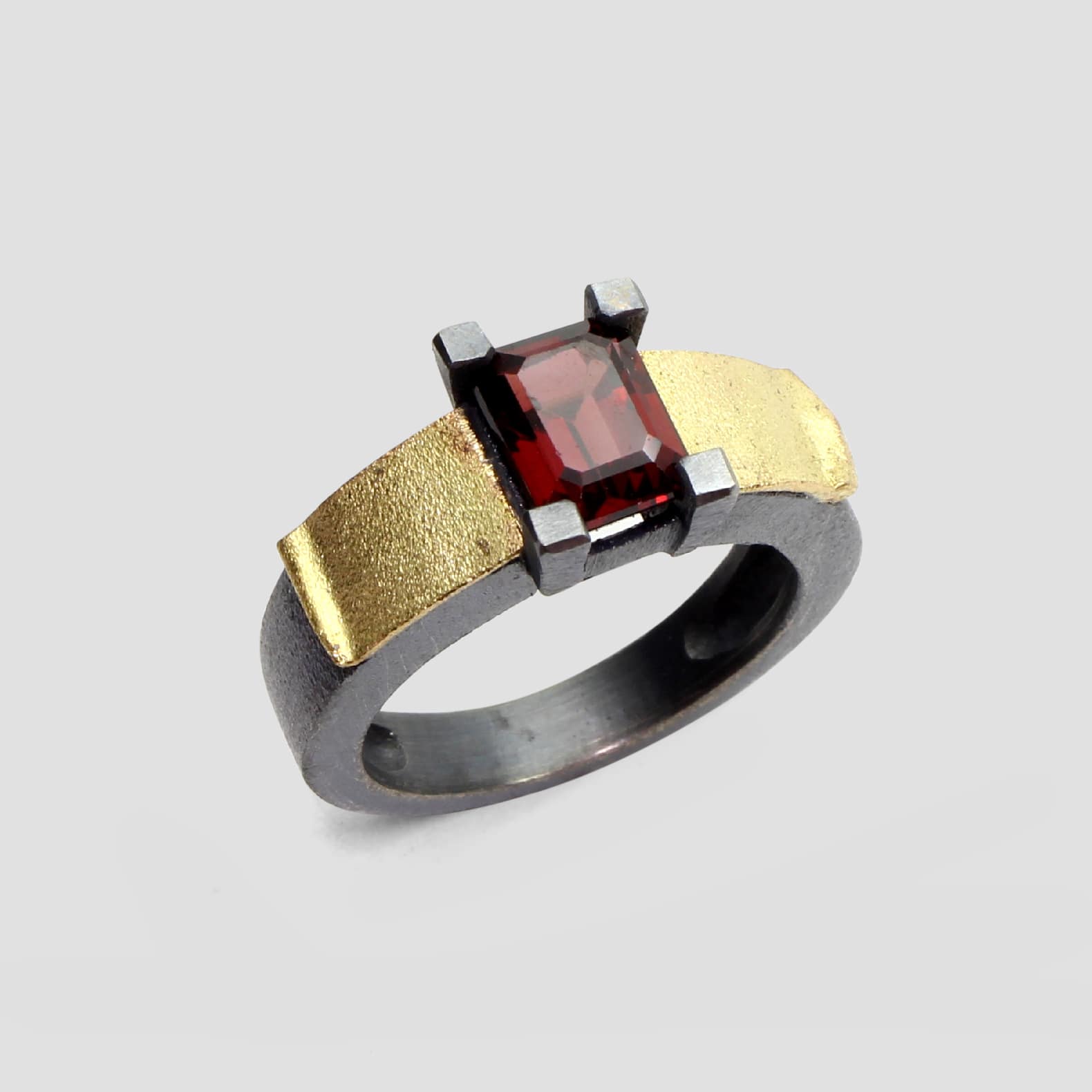 Anillo de plata, oro amarillo de 18k y un granate.