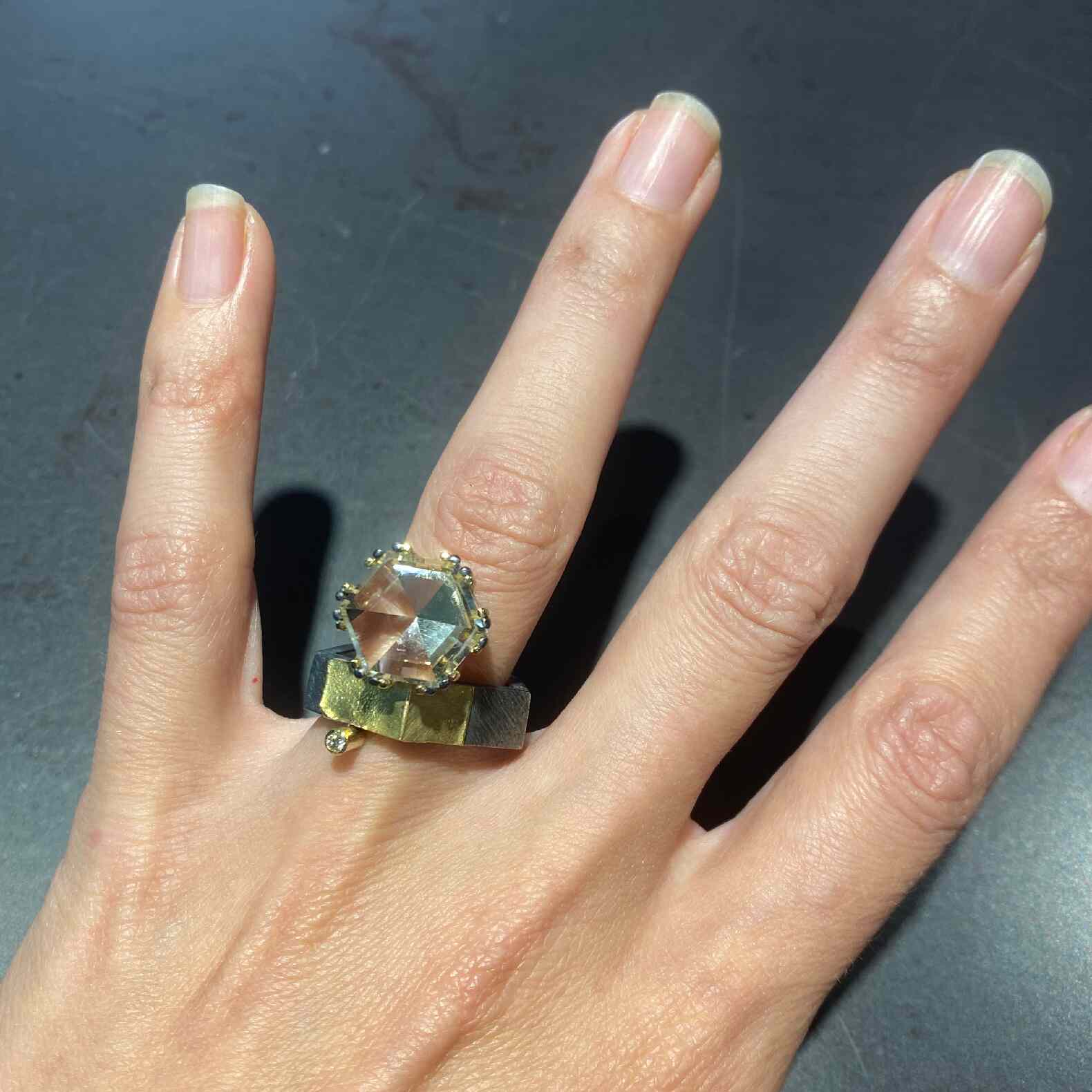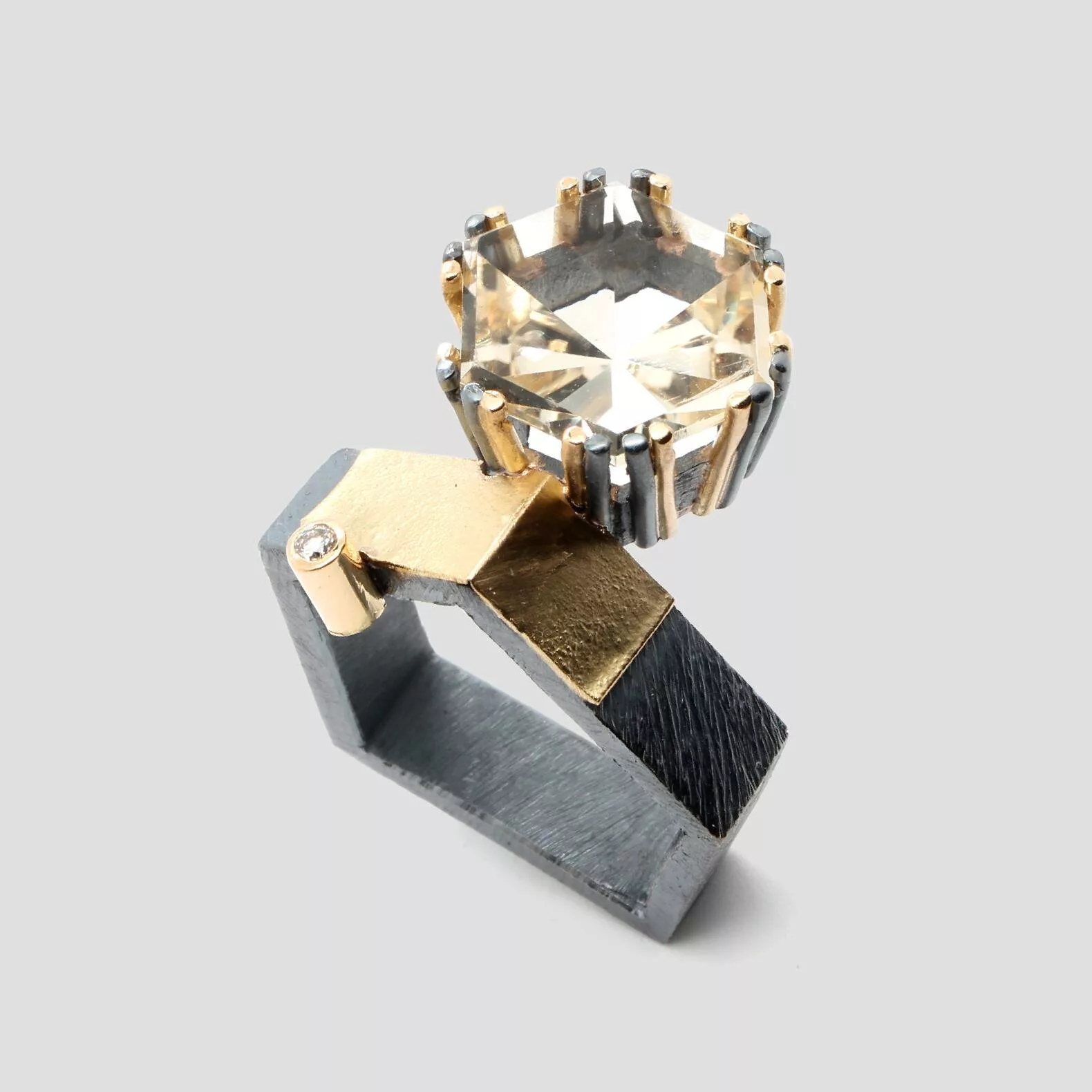 Anillo de plata, oro amarillo de 18k, un diamante natural talla brillante y un citrino talla espejo.