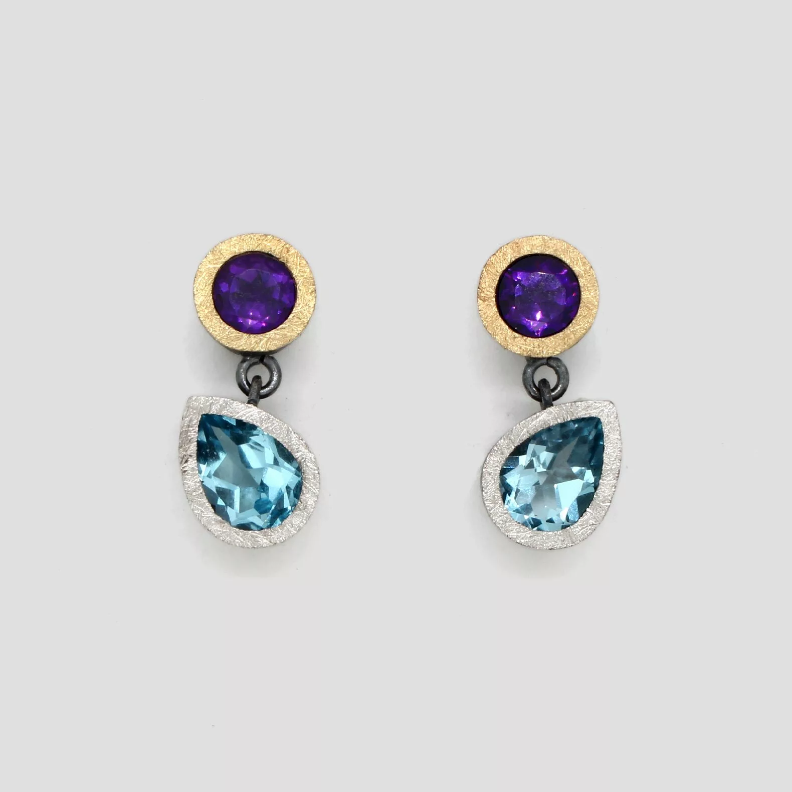 Pendientes de plata, oro amarillo de 18k, dos amatistas y dos topacios azules.