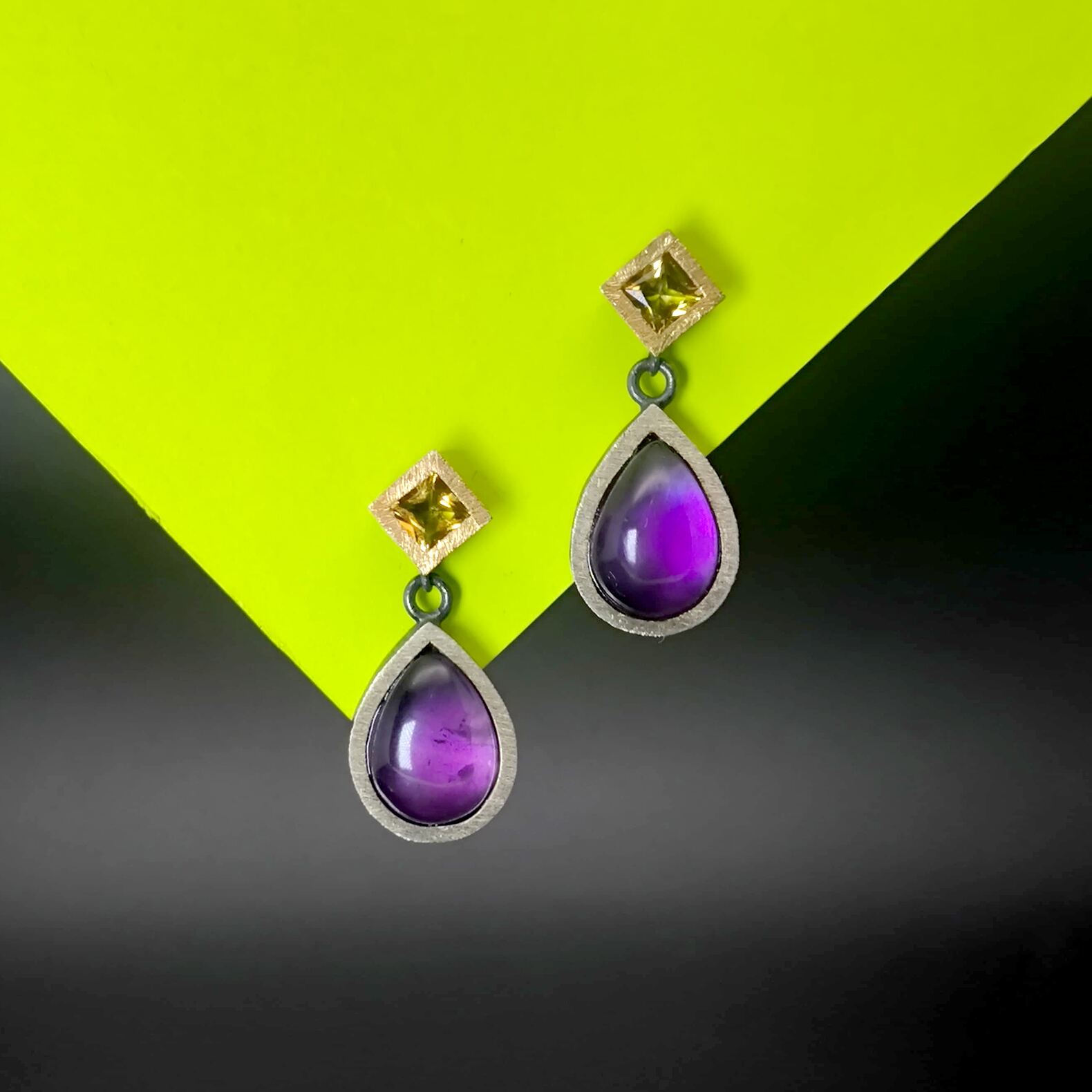 Pendientes de plata, oro amarillo de 18k, dos citrinos y dos amatistas.