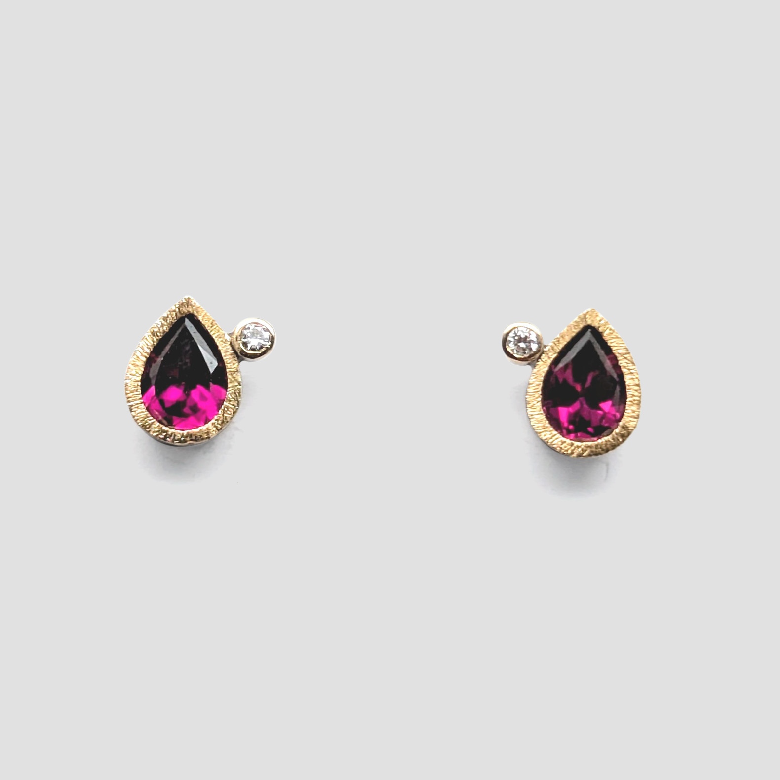 Pendientes de plata, oro amarillo de 18k, dos diamantes naturales talla brillante y dos rodolitos.