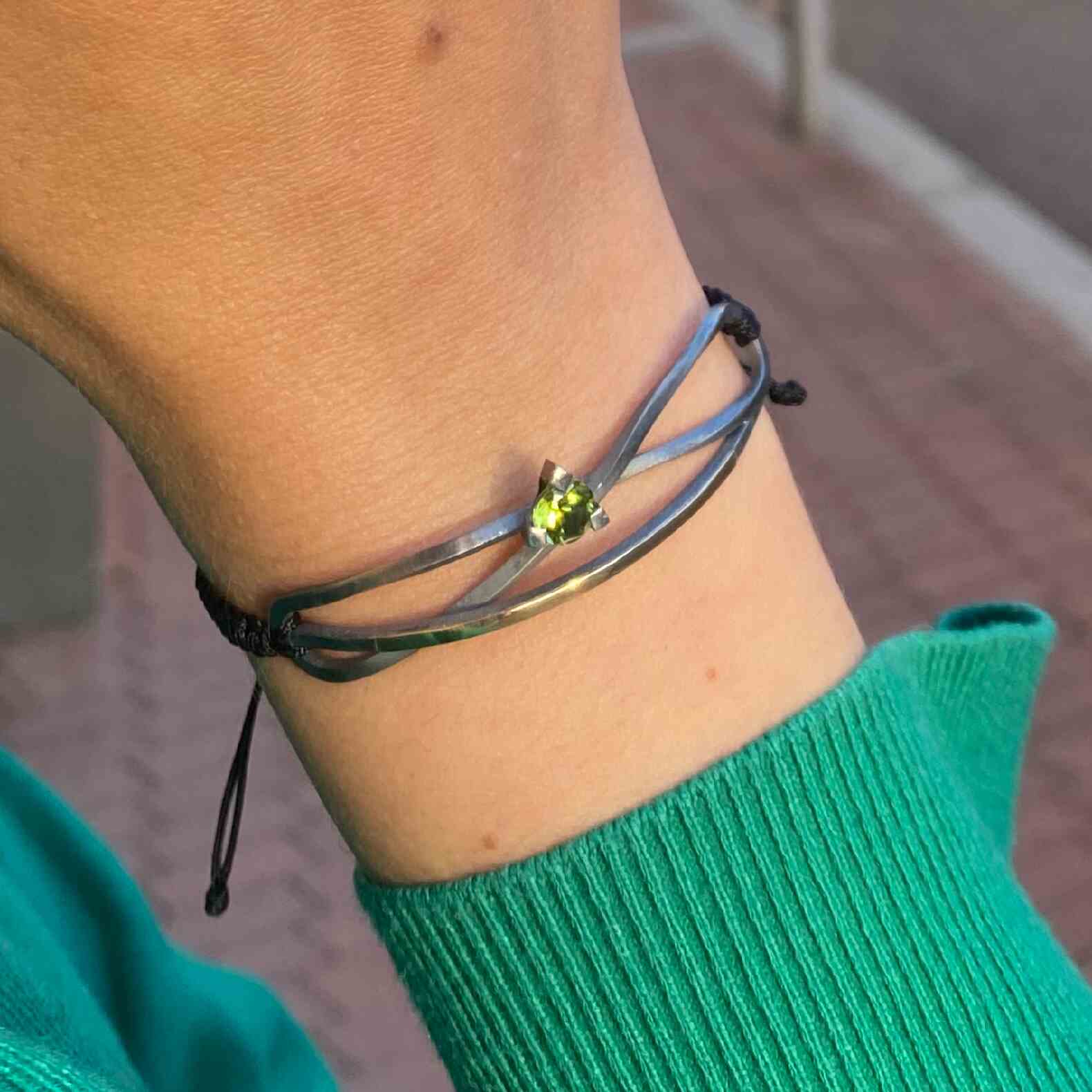 Pulsera de plata, oro amarillo de 18k, un peridoto y macramé.