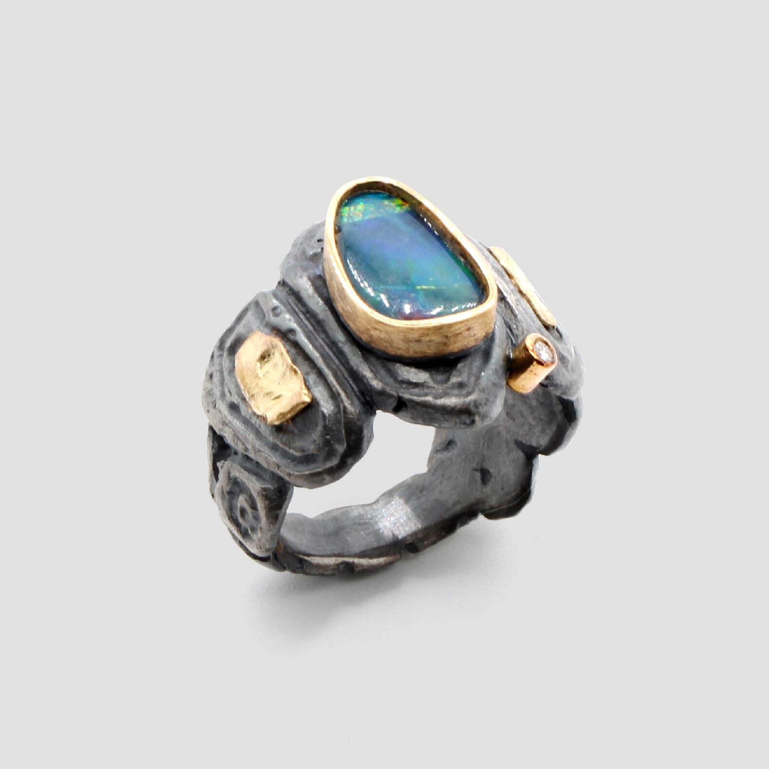 La naturaleza a veces nos sorprende con un magnífico ópalo doublet; la plata, el oro amarillo de 18k y un diamante natural talla brillante rematan este anillo único.