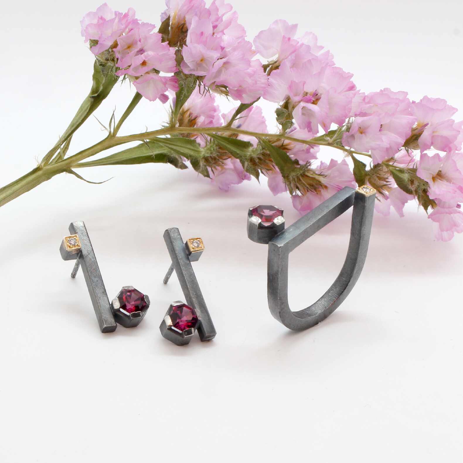 Anillo de plata, oro amarillo de 18k, un diamante natural talla brillante y un rodolito.
