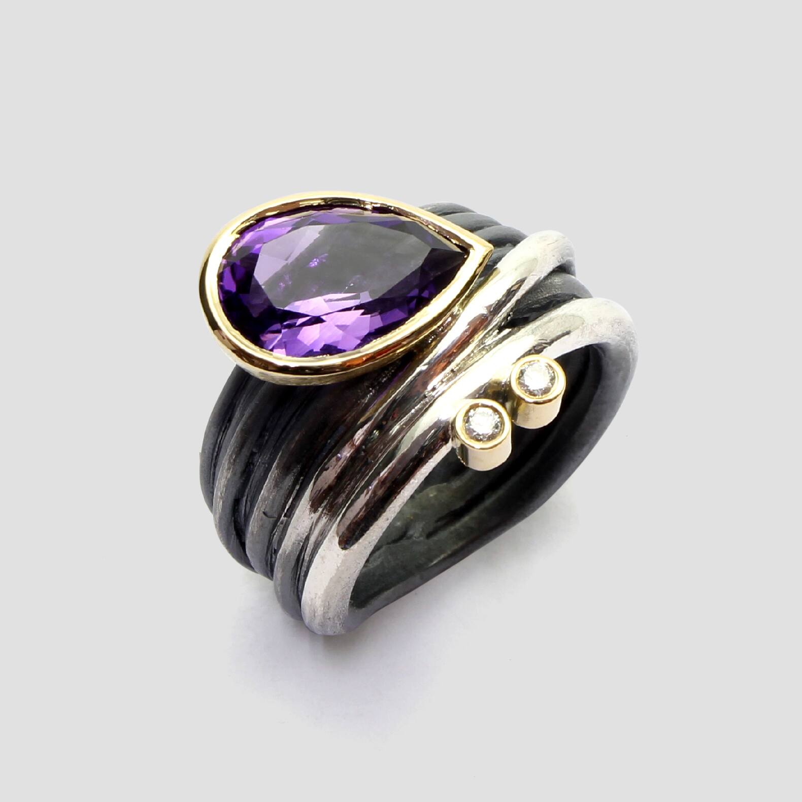 Anillo de plata, oro amarillo de 18k, dos diamantes naturales talla brillante y una amatista.