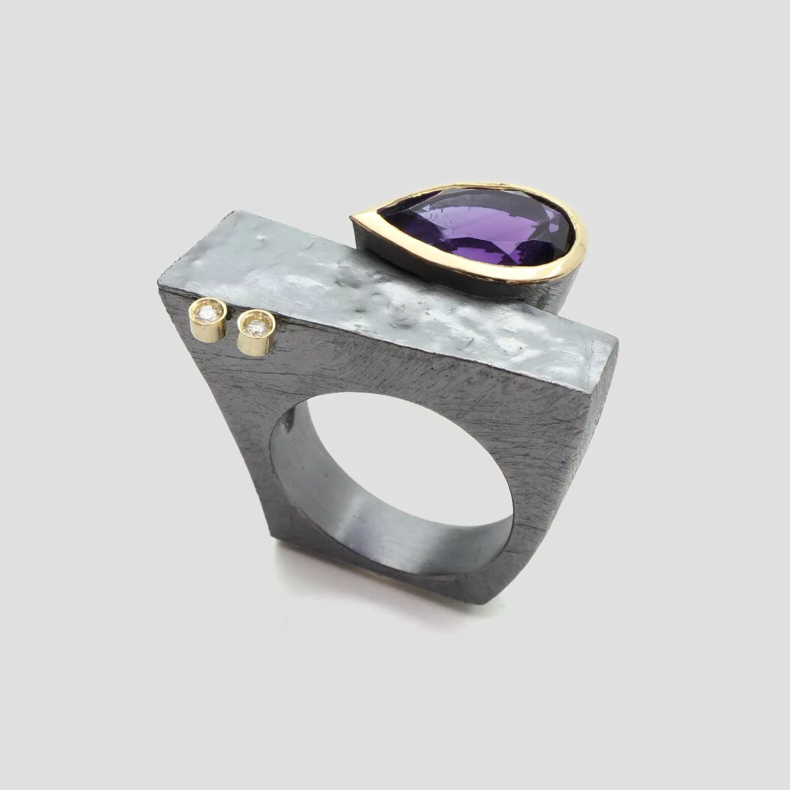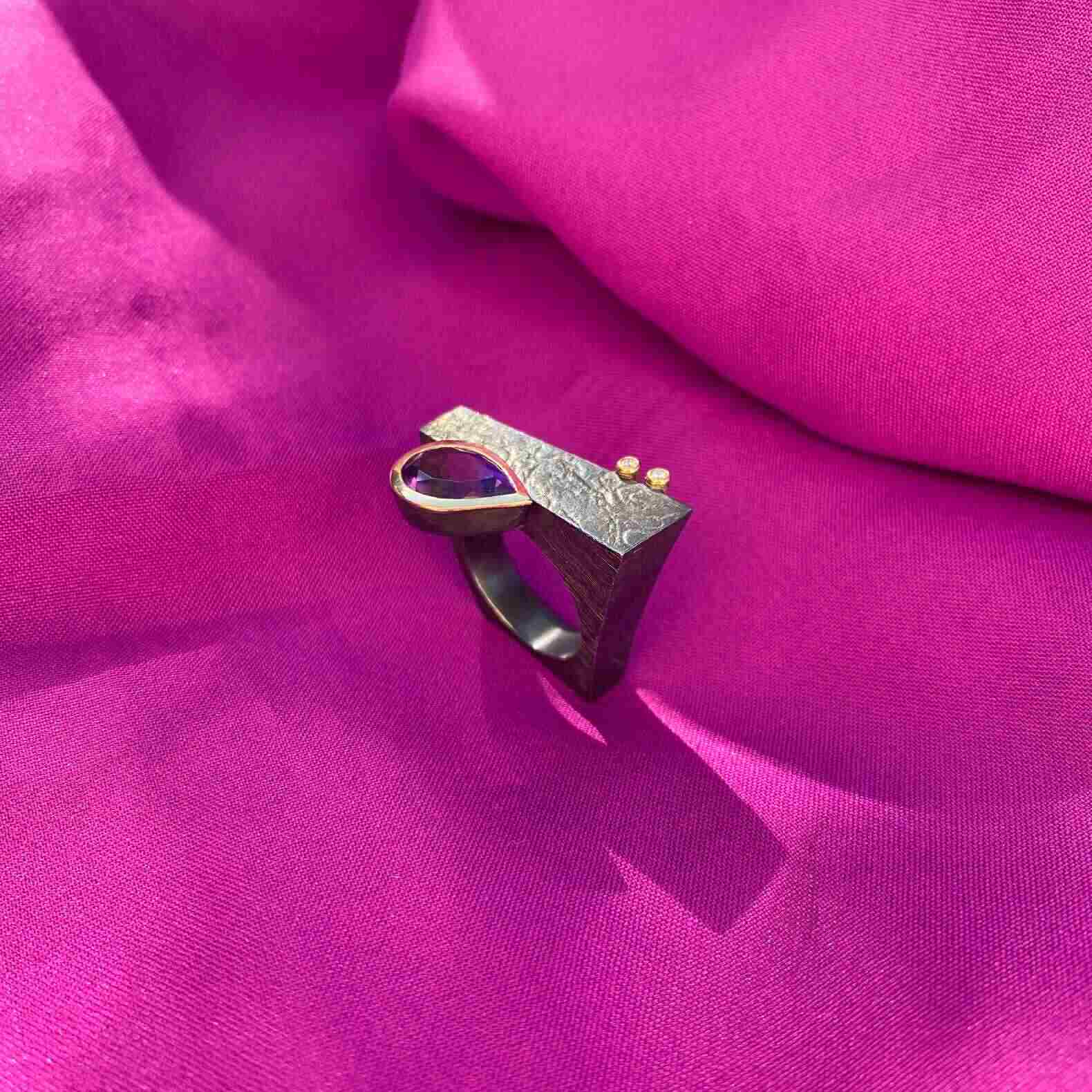 Anillo realizado en plata y oro amarillo de 18k con una preciosa amatista y dos diamantes naturales talla brillante.
