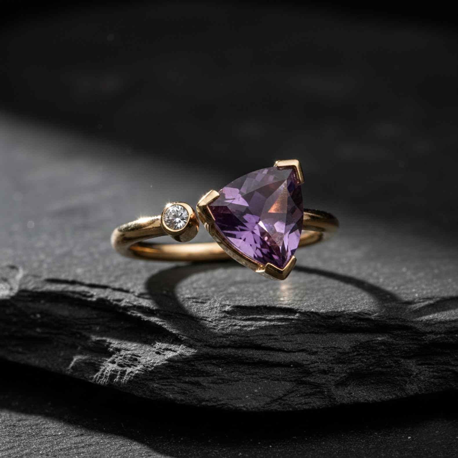 Anillo de oro amarillo de 18k, un diamante natural talla brillante y una amatista africana talla triángulo.