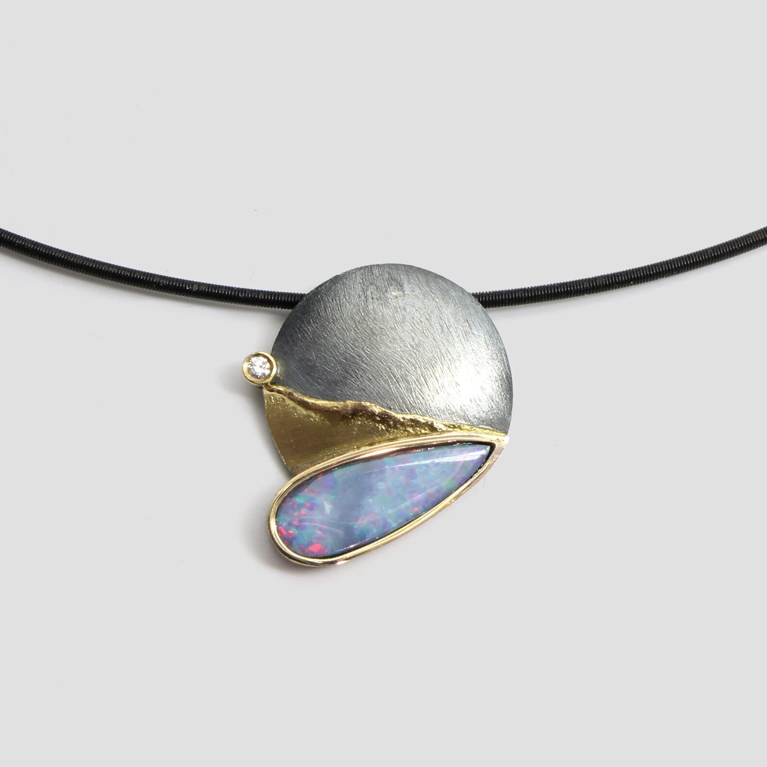Magnífico colgante con un ópalo doublet multicolor y un diamante natural talla brillante acabado en plata y oro amarillo de 18k.