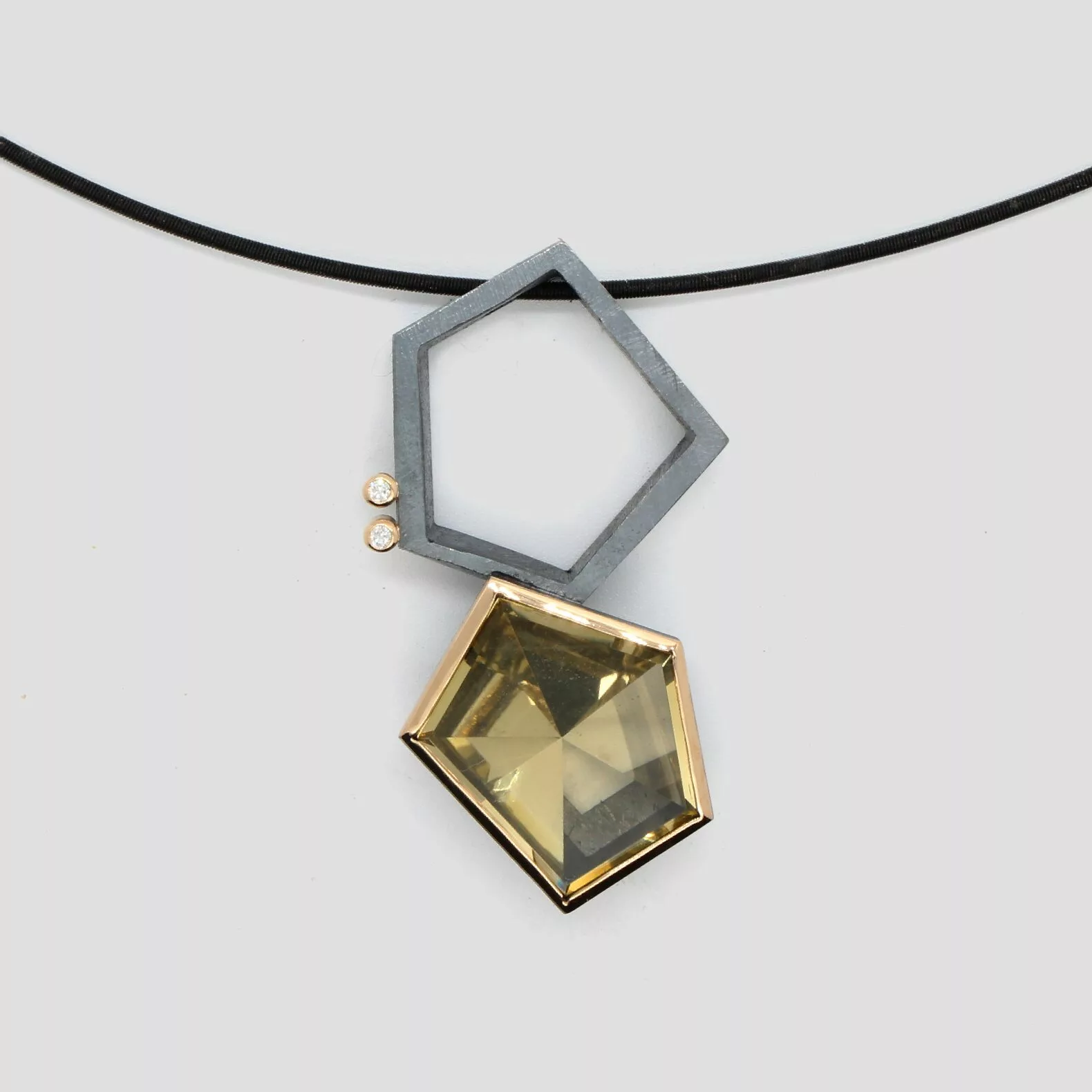 Un cuarzo limón es el protagonista de este colgante en plata, oro amarillo de 18k y dos diamantes naturales talla brillante.