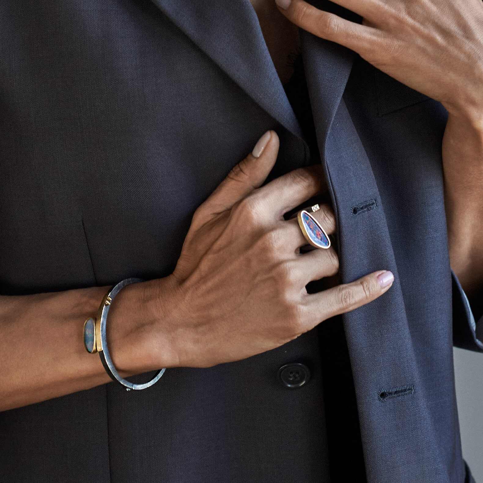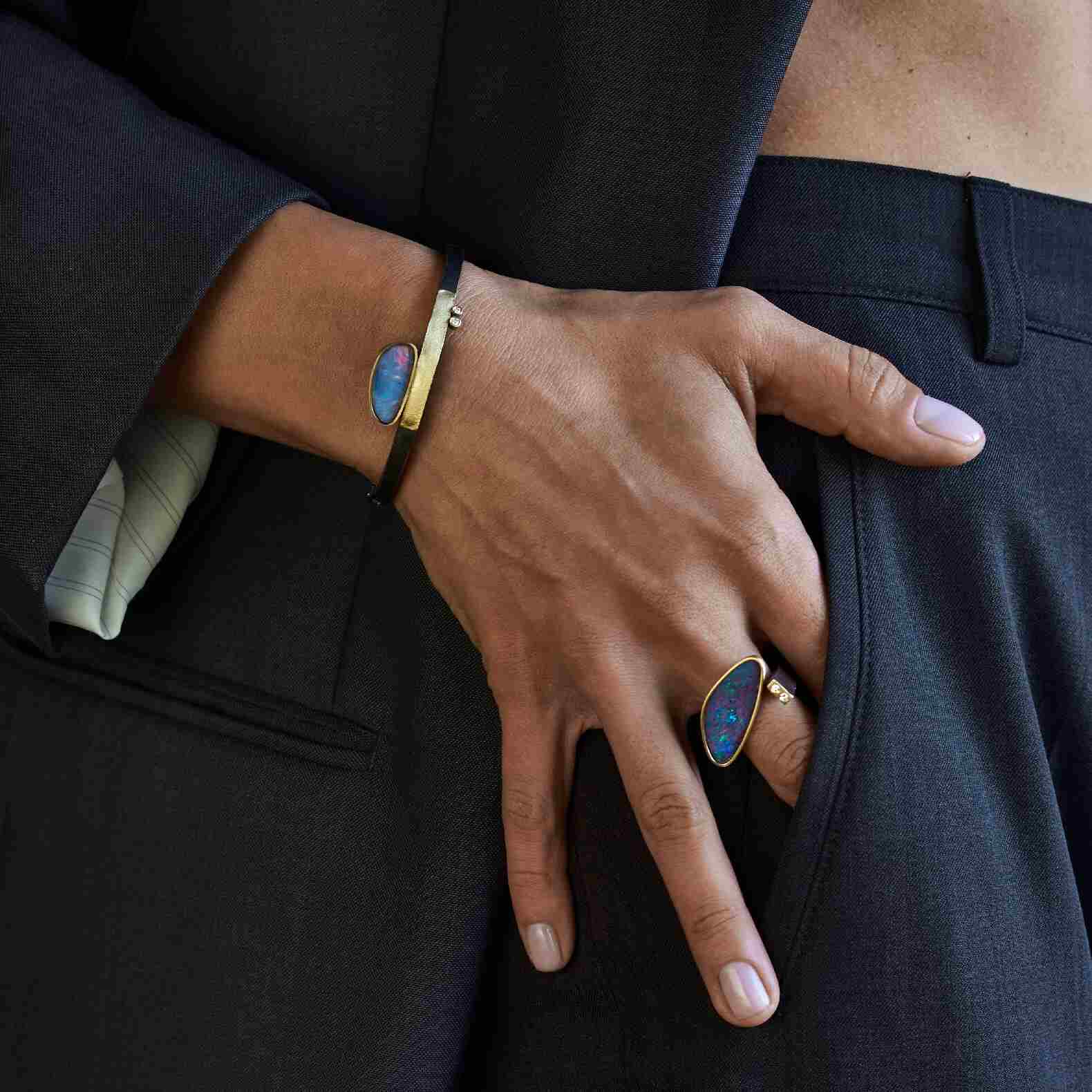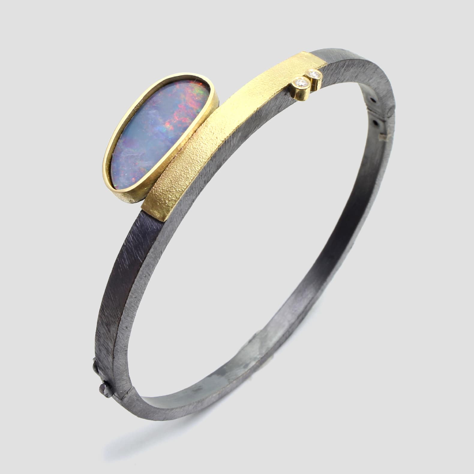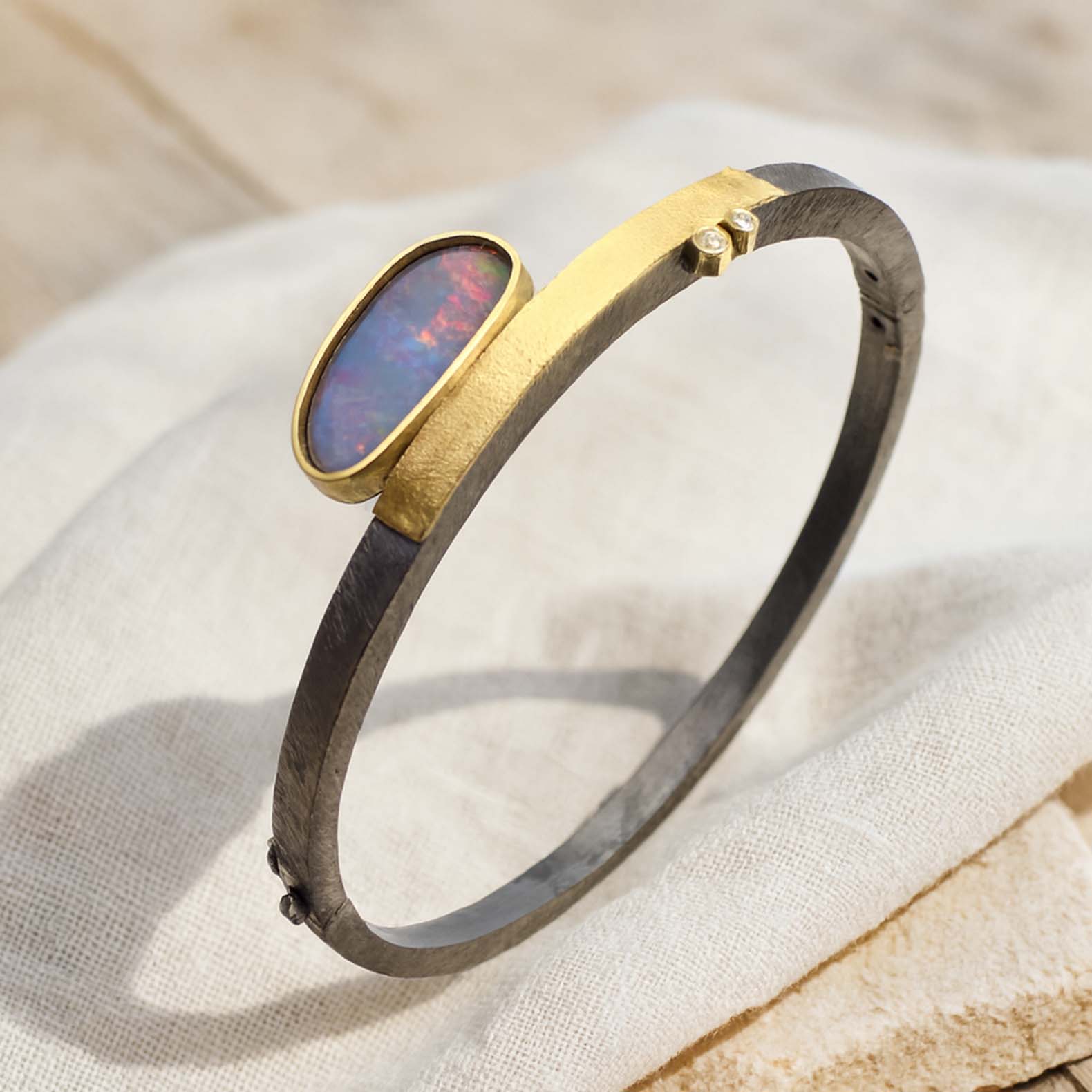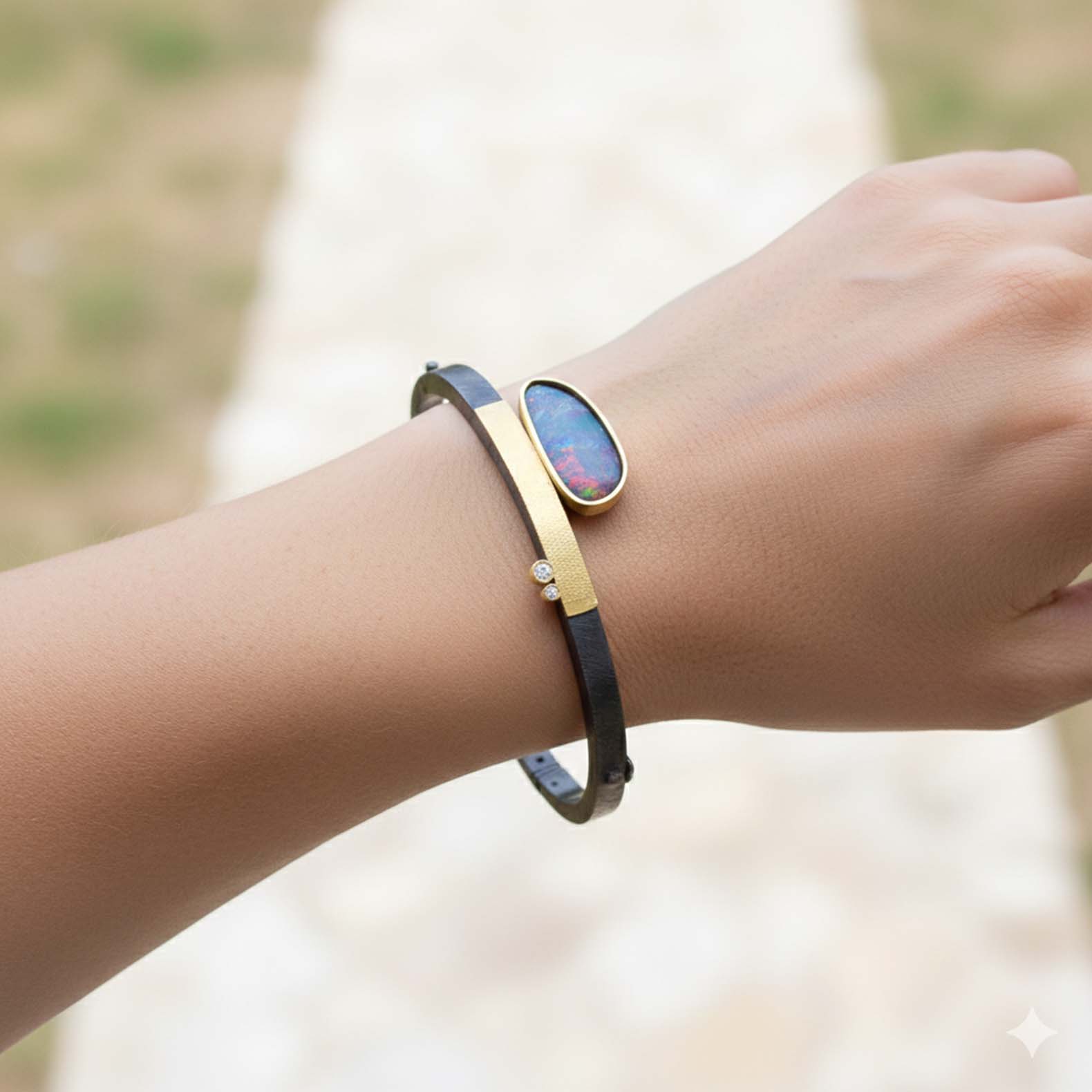 Elegante pulsera en plata, oro, un ópalo doublet y dos diamantes naturales talla brillante. Los colores de ópalo dan vida a esta pieza única.