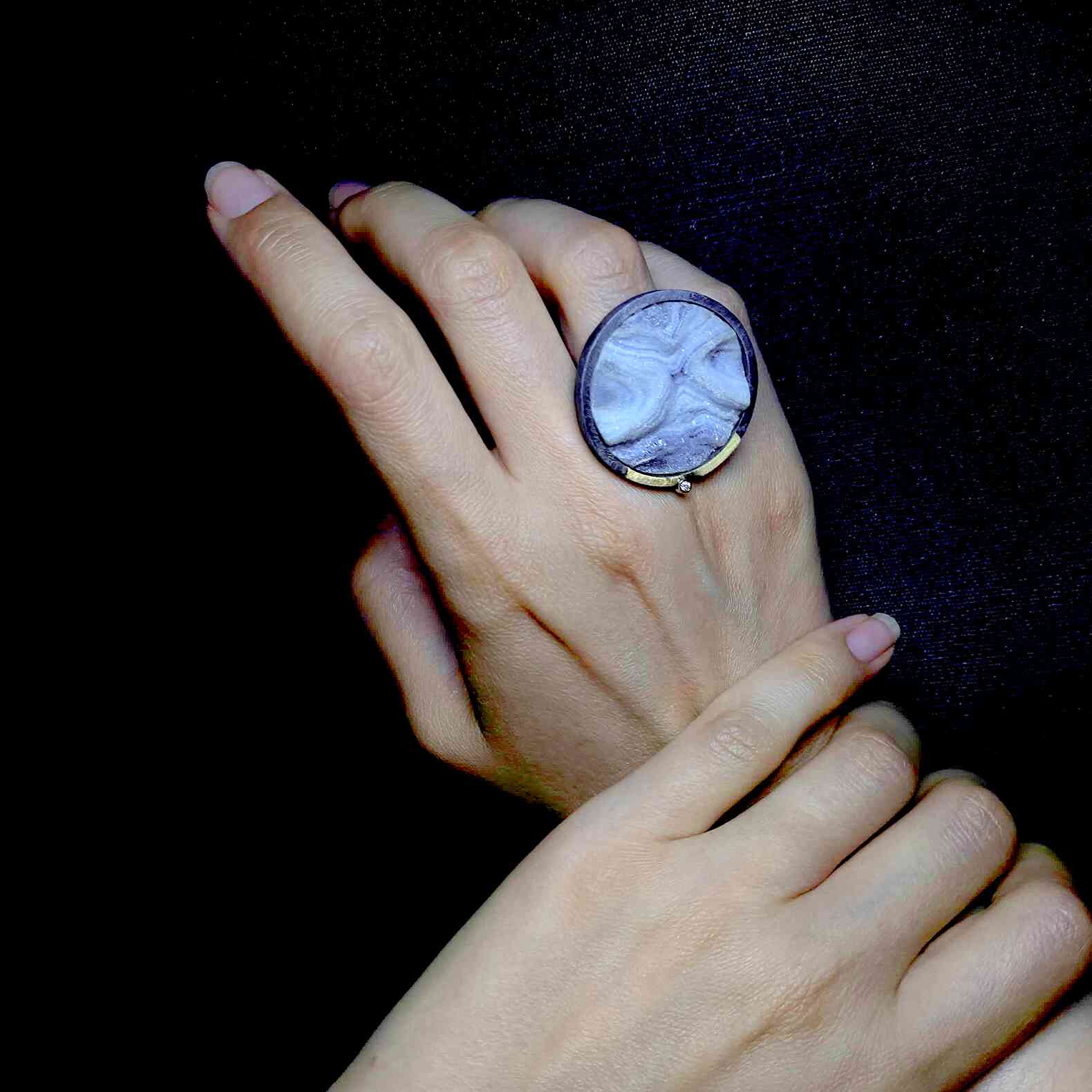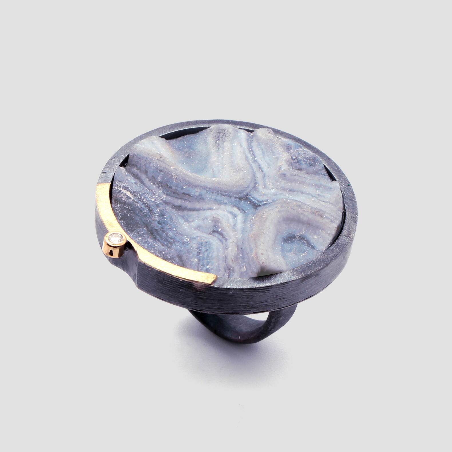 Anell de plata, or groc de 18q, un diamant natural talla brillant i una espectacular calcedònia.