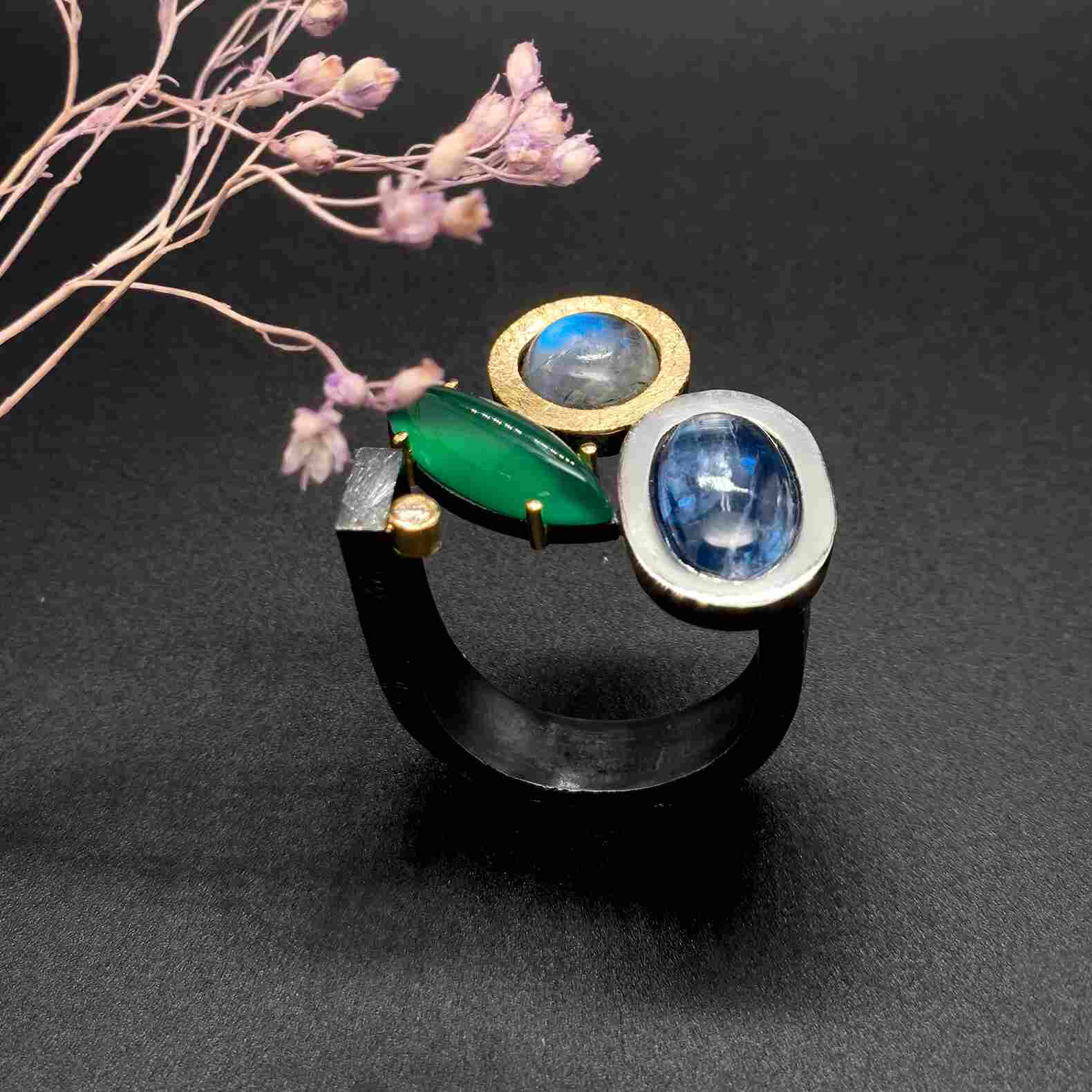 Anell de plata i or groc de 18q amb una pedra lluna, una cianita, una crisoprasa i un diamant natural talla brillant que combinen llum, equilibri i elegància en una sola peça.