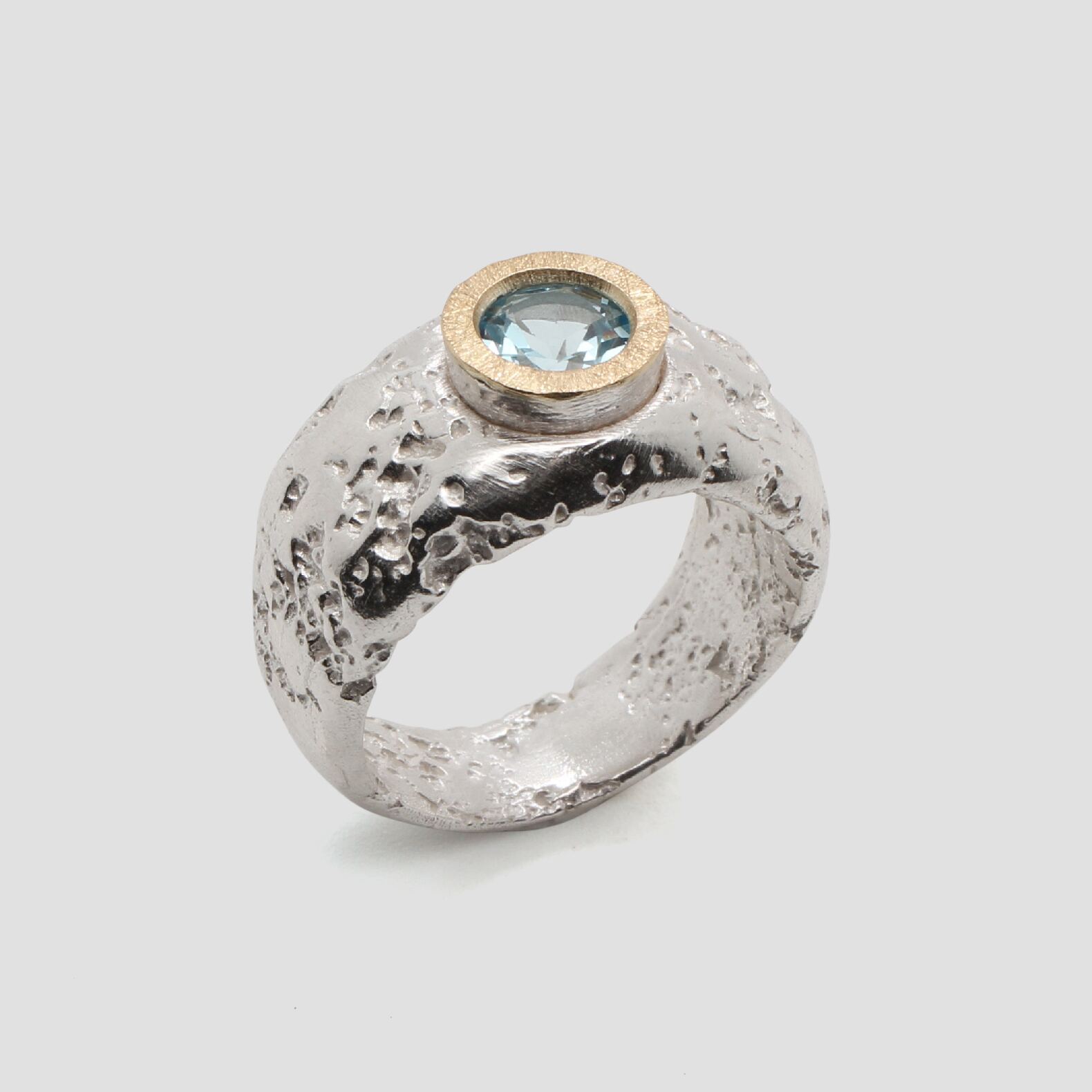 Anell de plata, or groc de 18q i un topazi blau de Brasil.