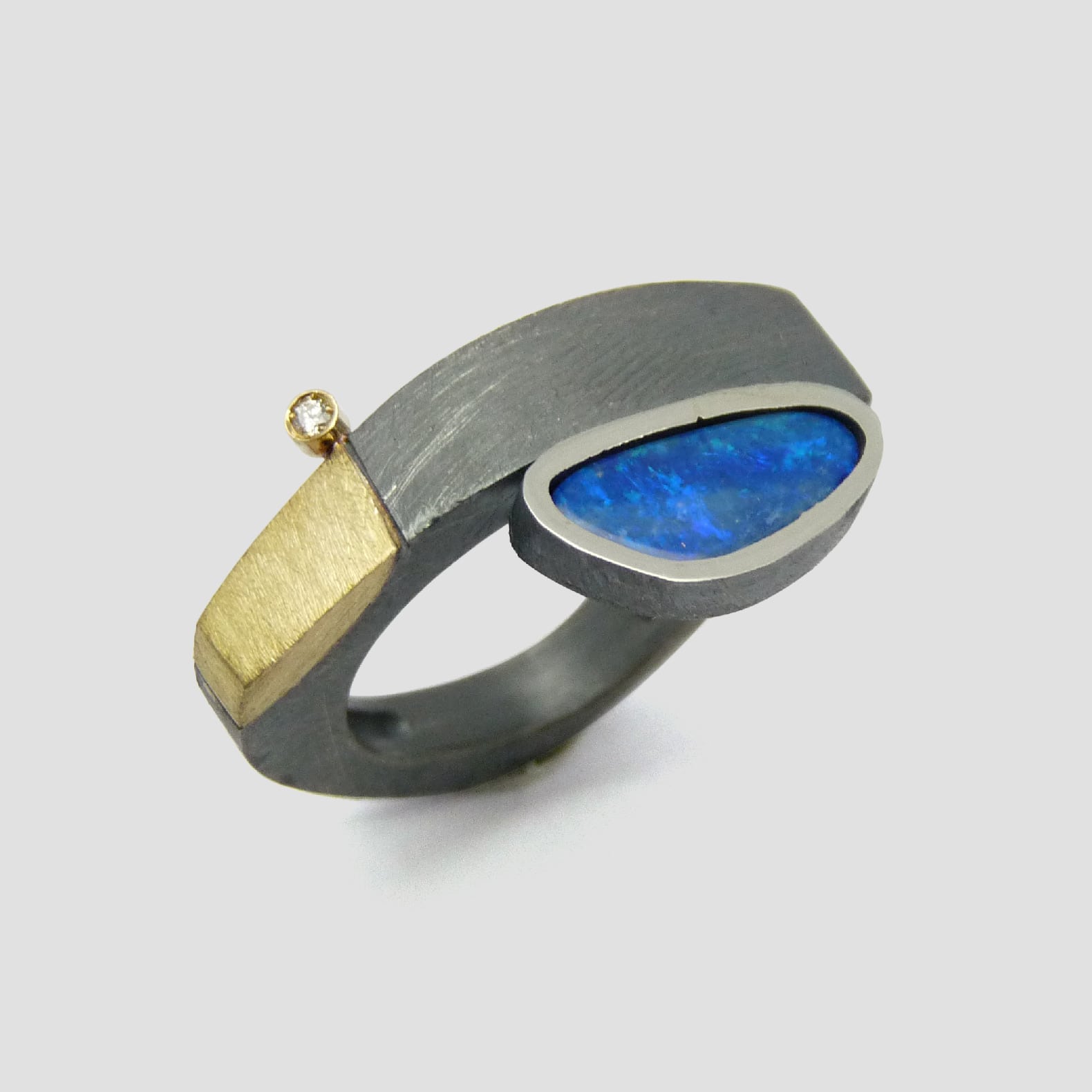 La suavitat de les formes són la característica principal d’aquest anell amb un òpal doublet i un preciós diamant natural talla brillant, una peça singular per a una persona única.