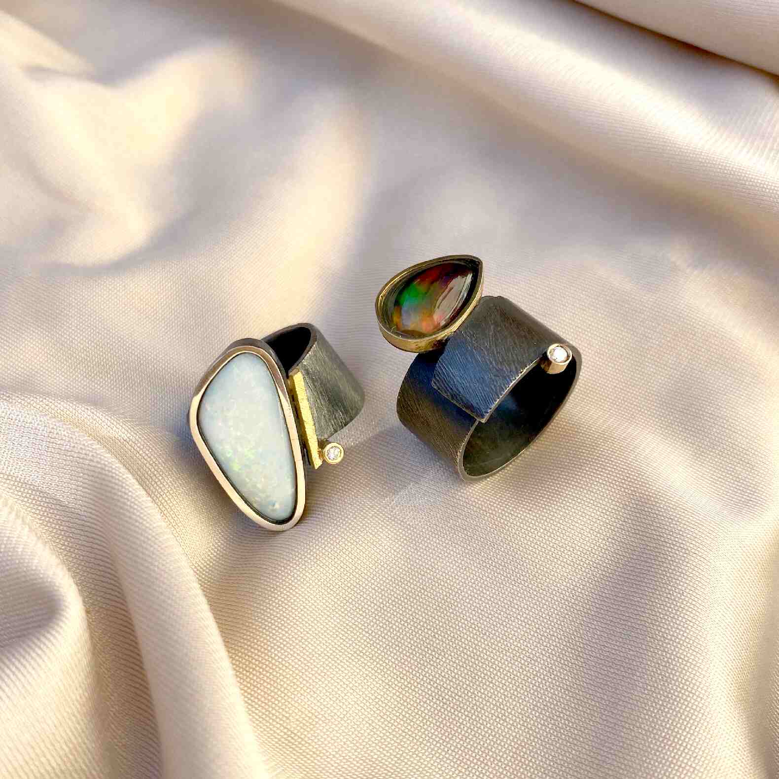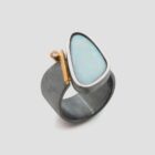 La natura de vegades ens sorprèn amb un magnífic òpal doublet; la plata, l’or groc de 18q i un diamant natural talla brillant rematen aquest anell únic.