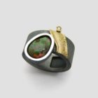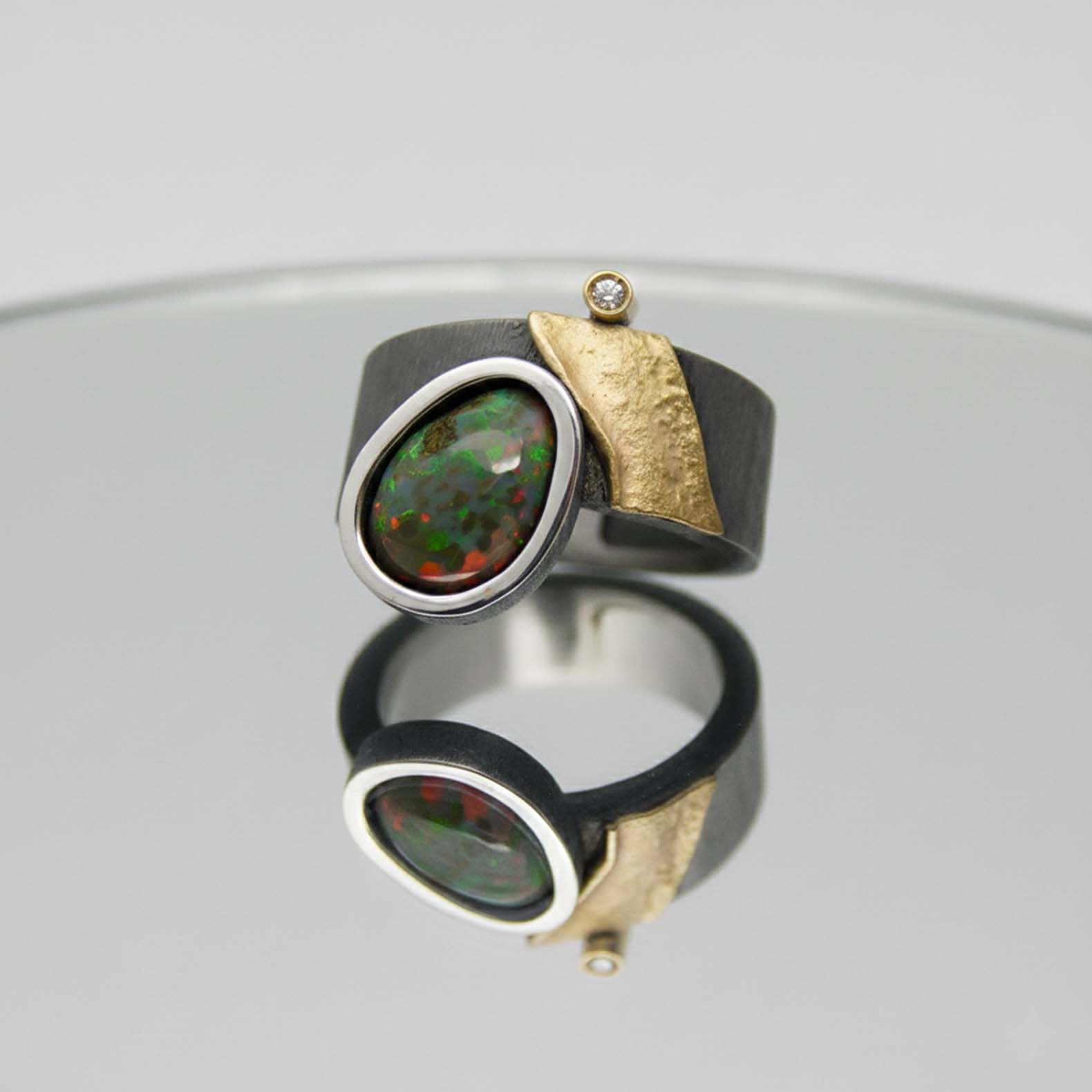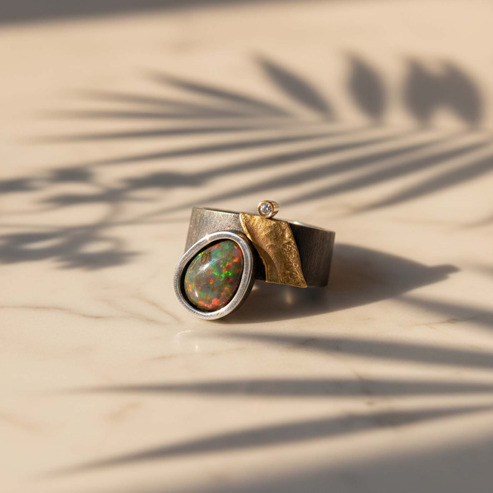 La natura de vegades ens sorprèn amb un magnífic òpal etíop multicolor; la plata, l’or groc de 18q i un diamant natural talla brillant rematen aquest anell únic.