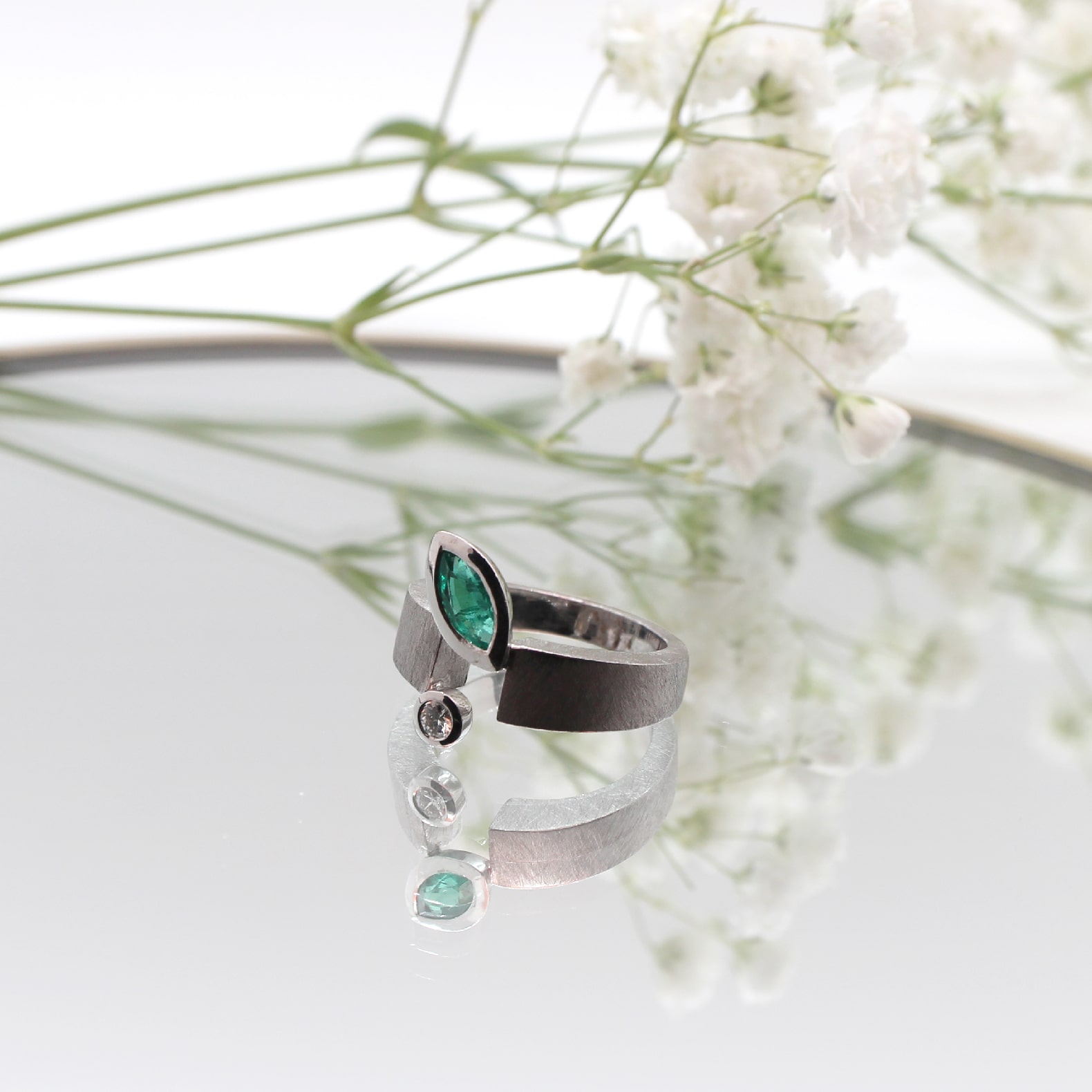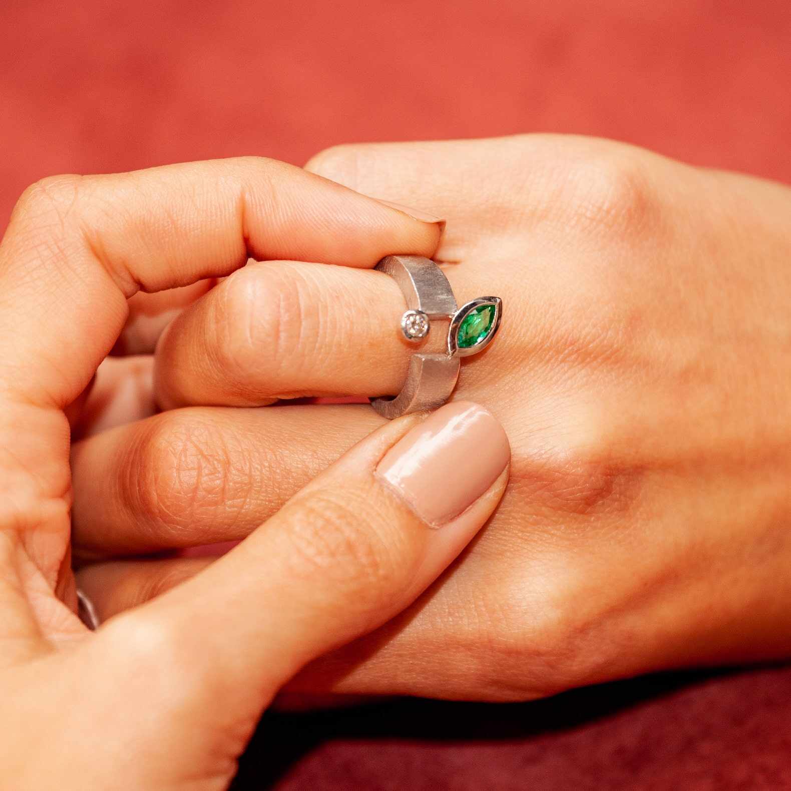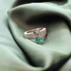 Anell de formes pures realitzat en or blanc de 18q amb un diamant natural talla brillant i una preciosa maragda de talla marquis, la sobrietat i l’elegància en una peça única.