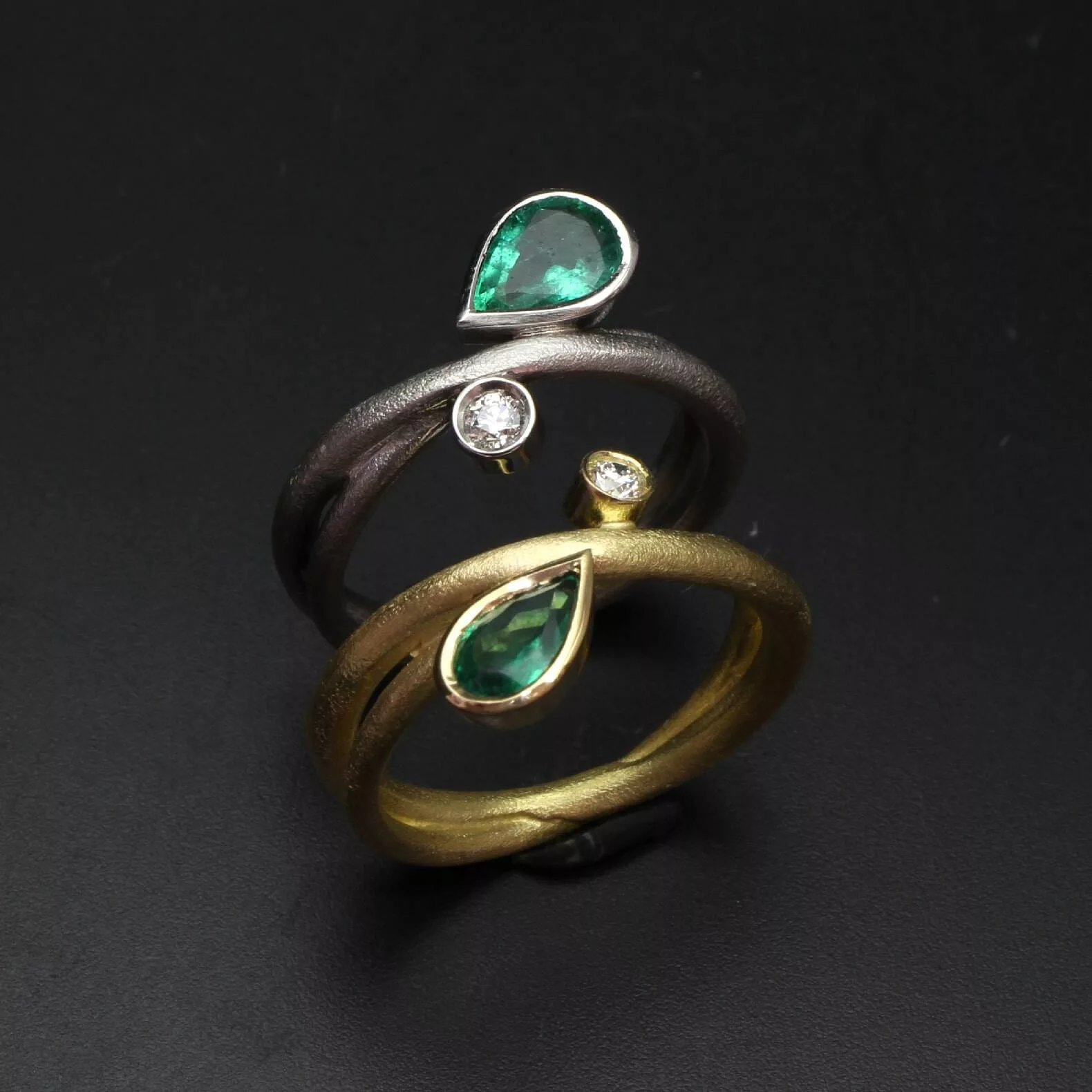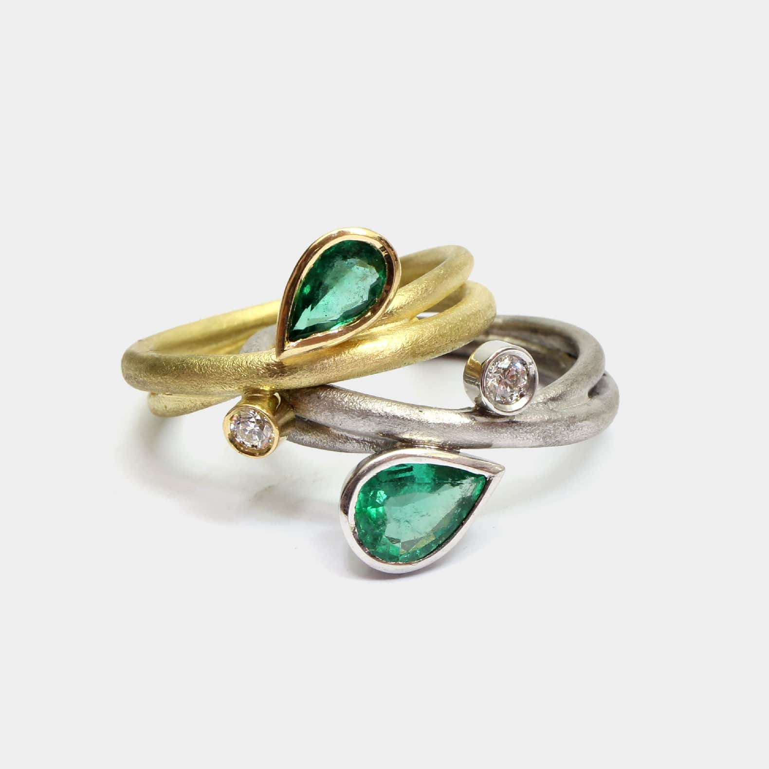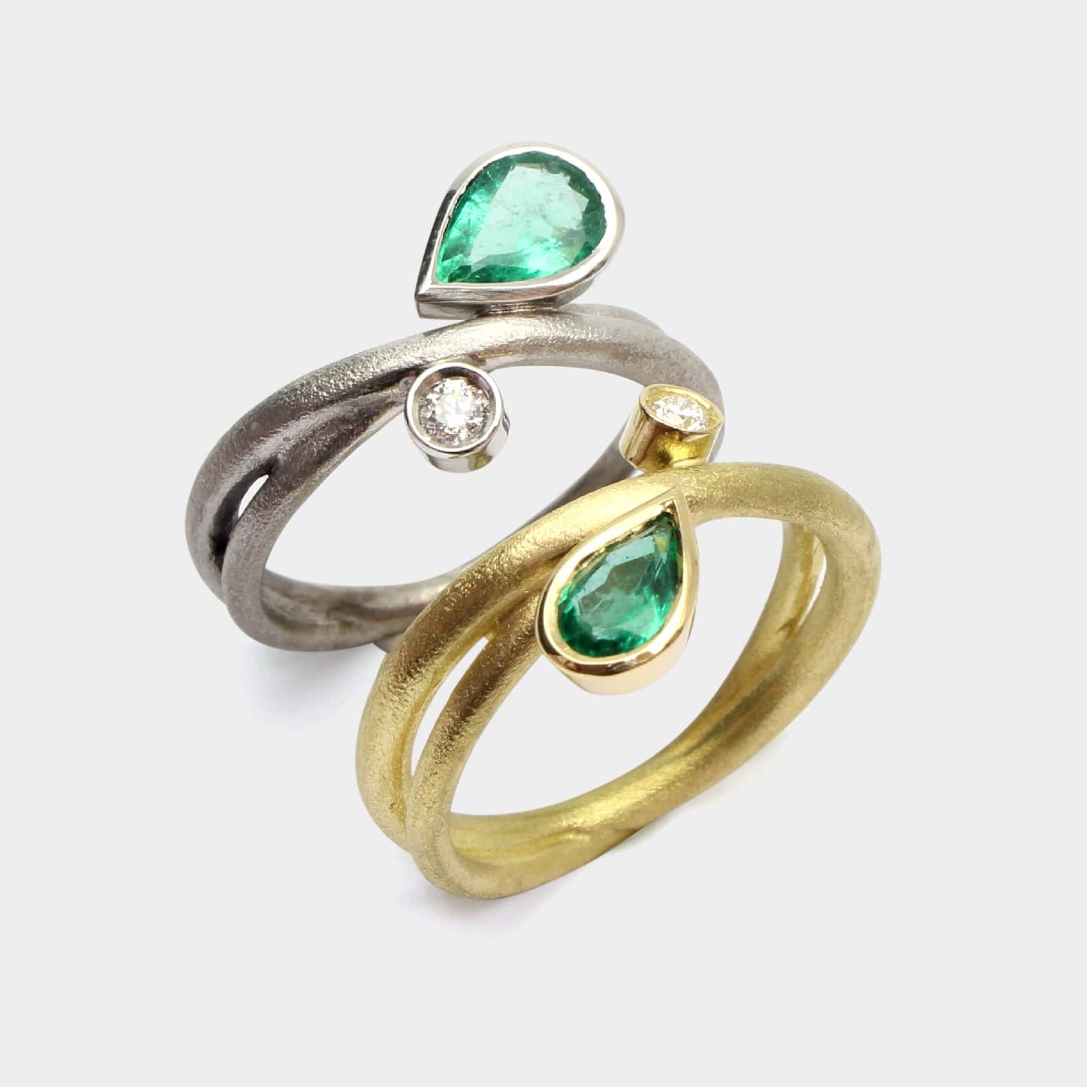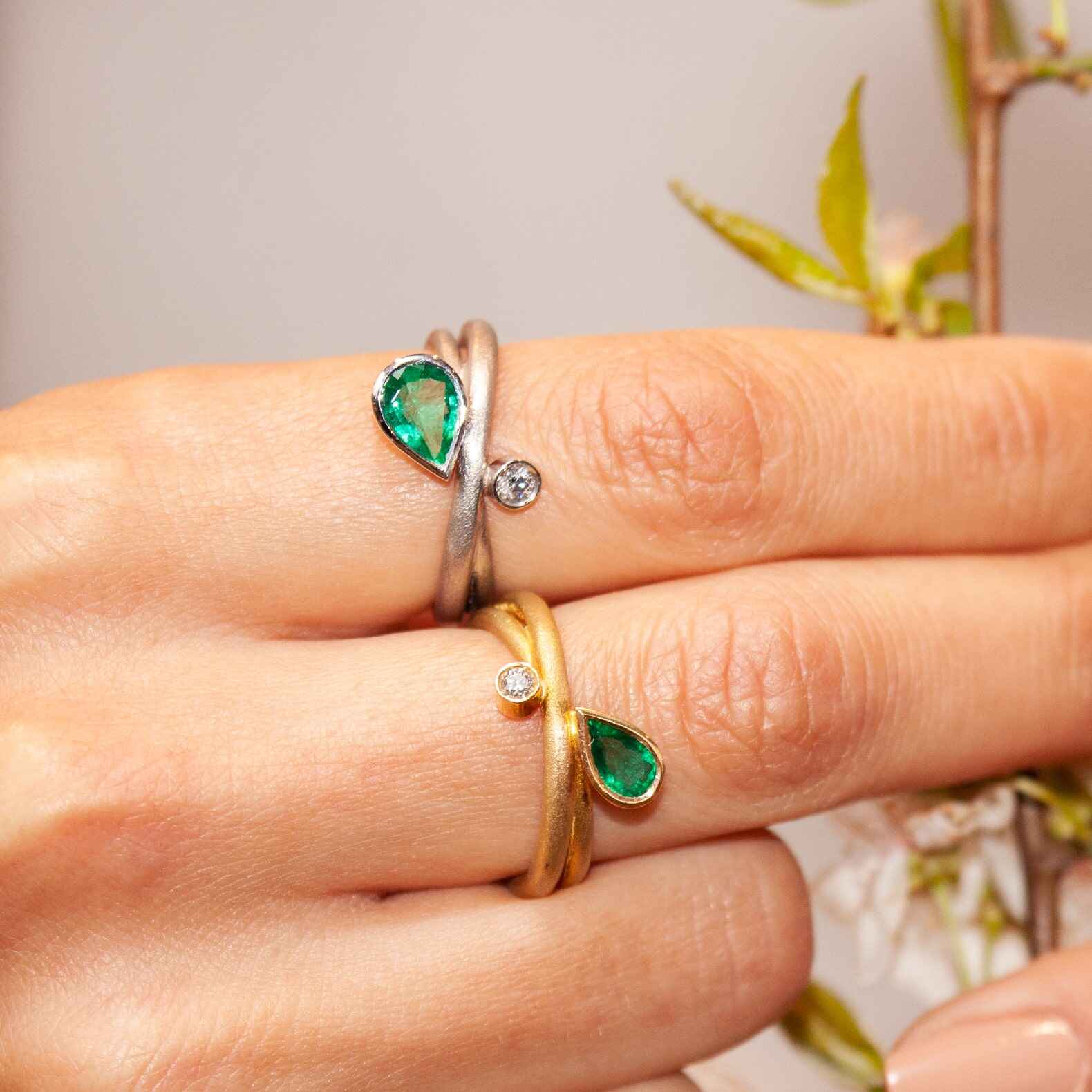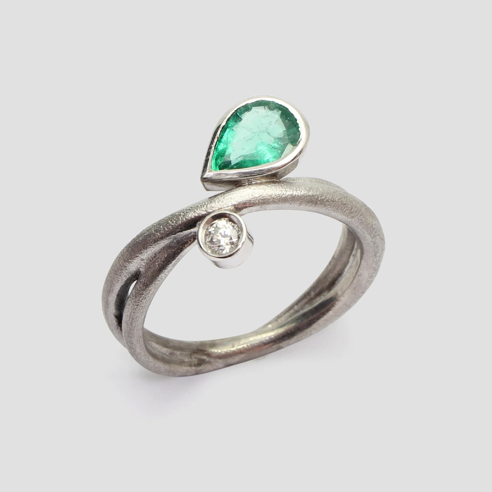 Anell de línies orgàniques, realitzat en or blanc de 18k amb una preciosa maragda i un diamant natural talla brillant.