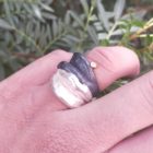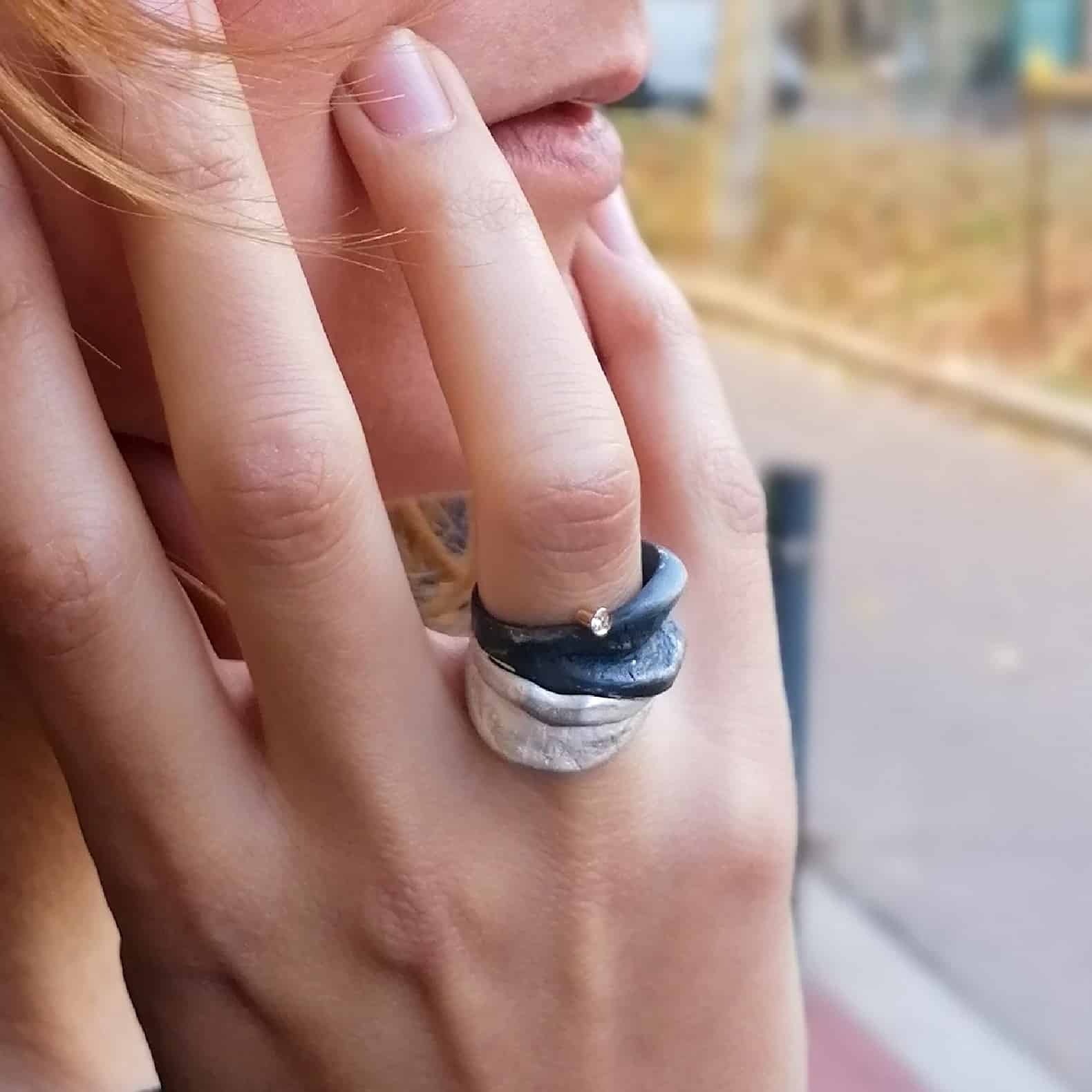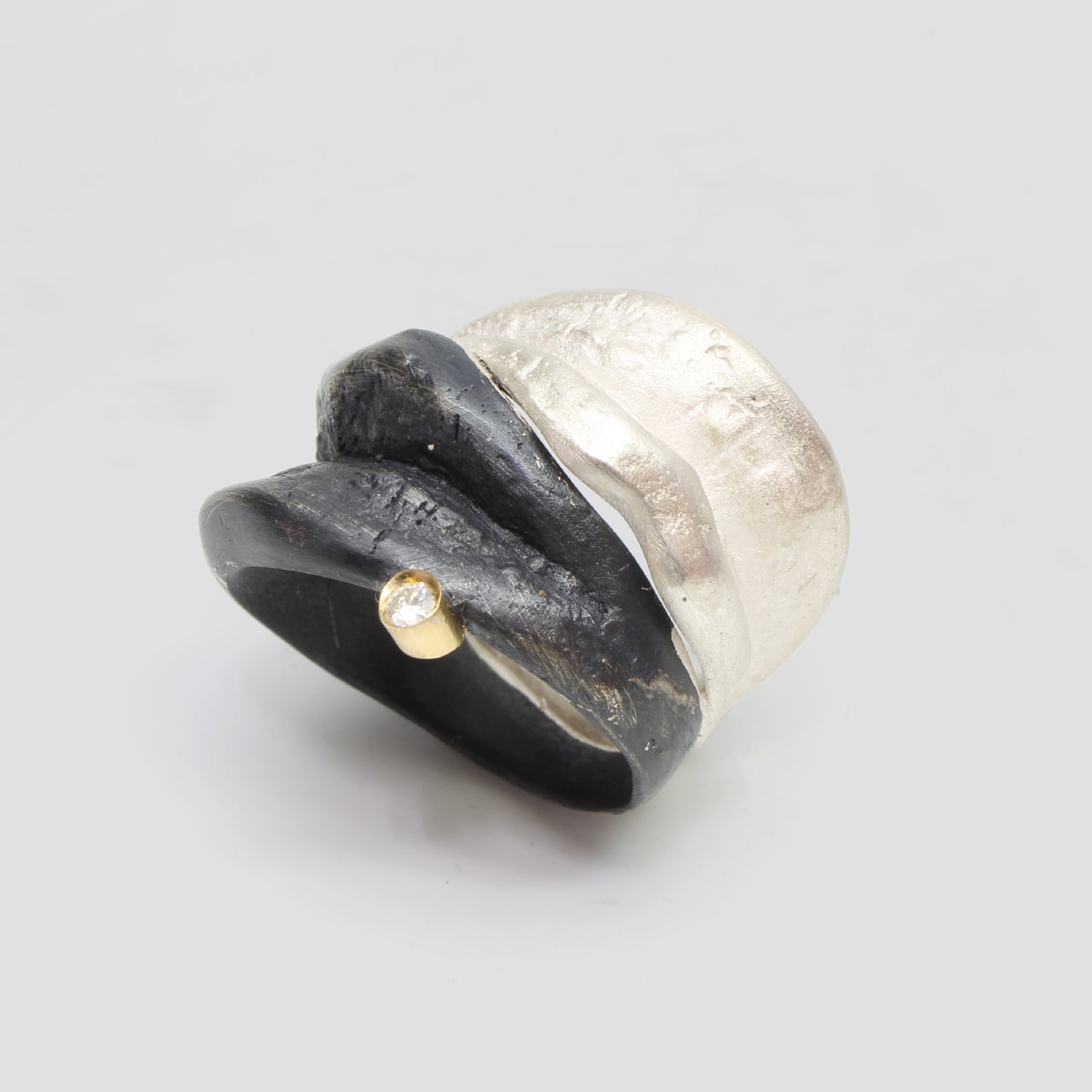 Anell de plata oxidada i blanca, or groc de 18q i un diamant natural talla brillant.