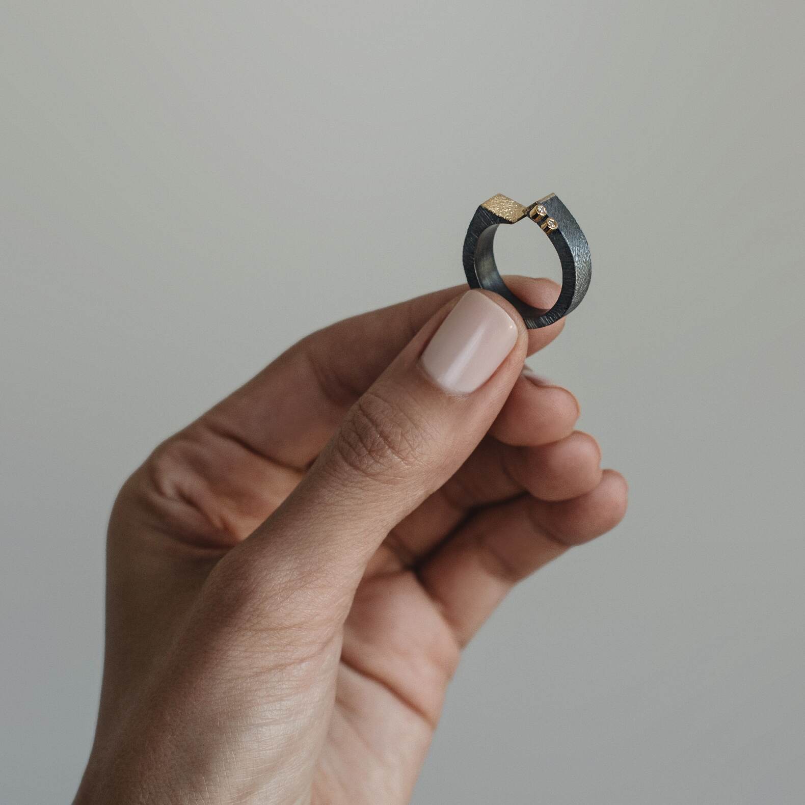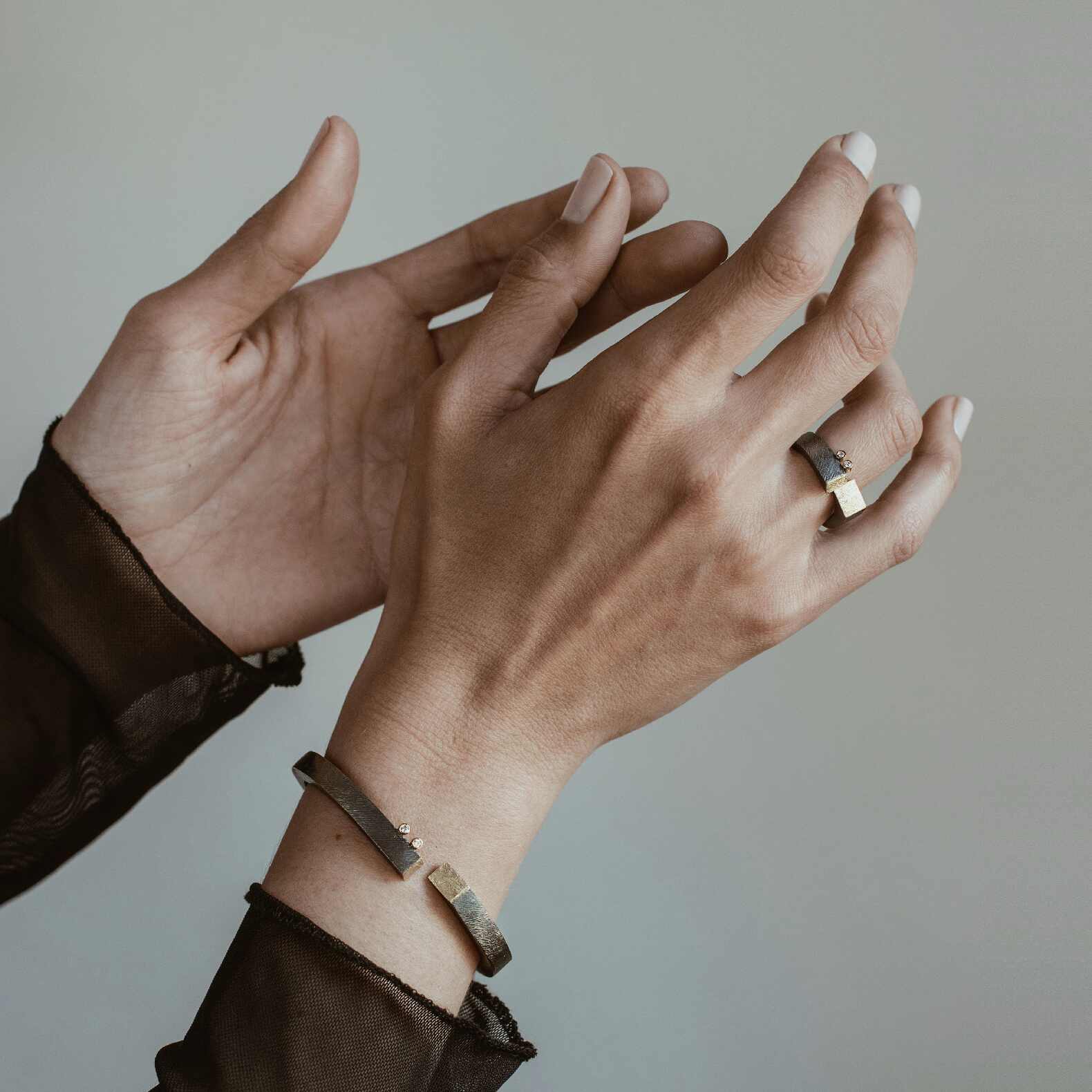 Anell de plata, or groc de 18q i dos diamants naturals talla brillant.