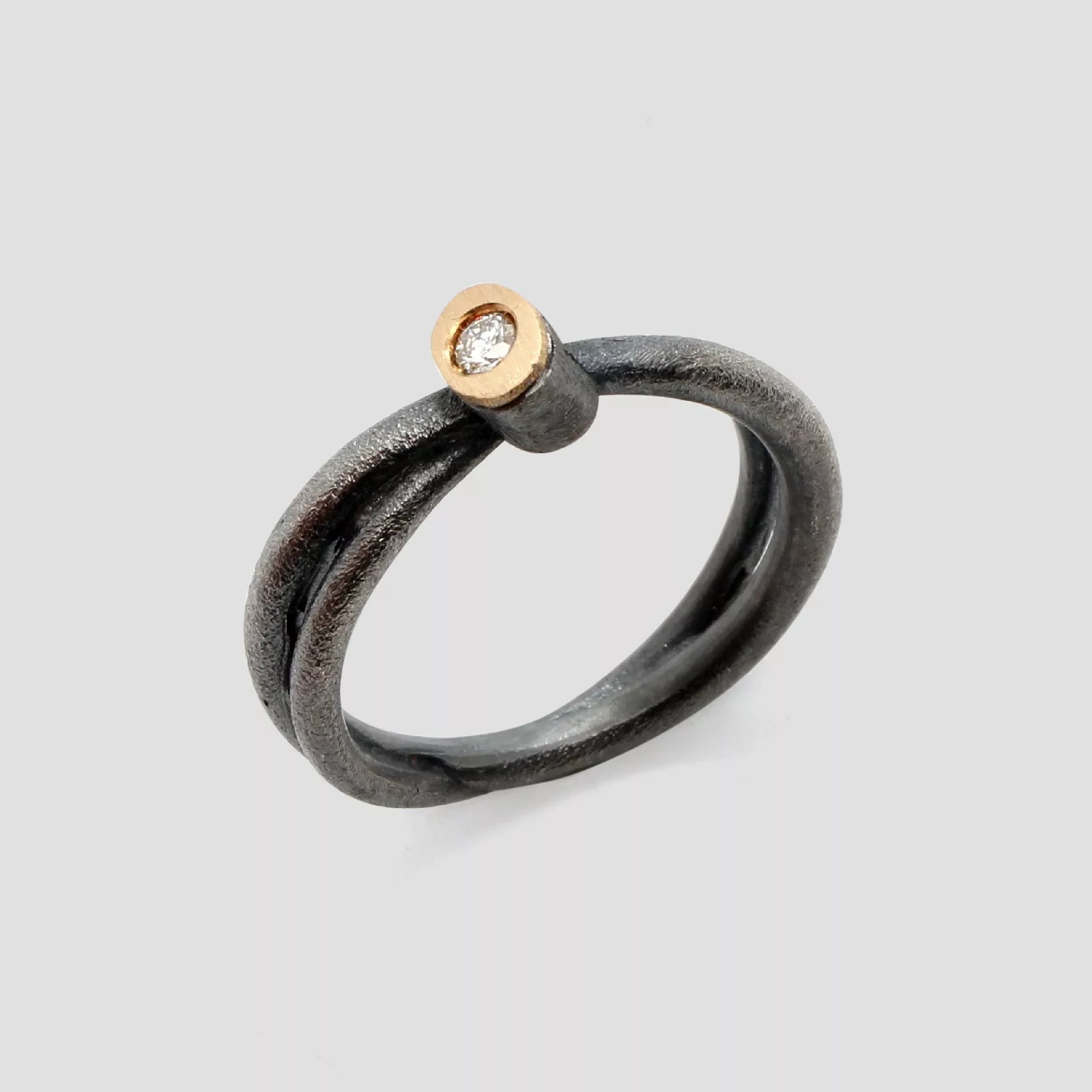 Anell de plata, or groc de 18q i un diamant natural talla brillant.