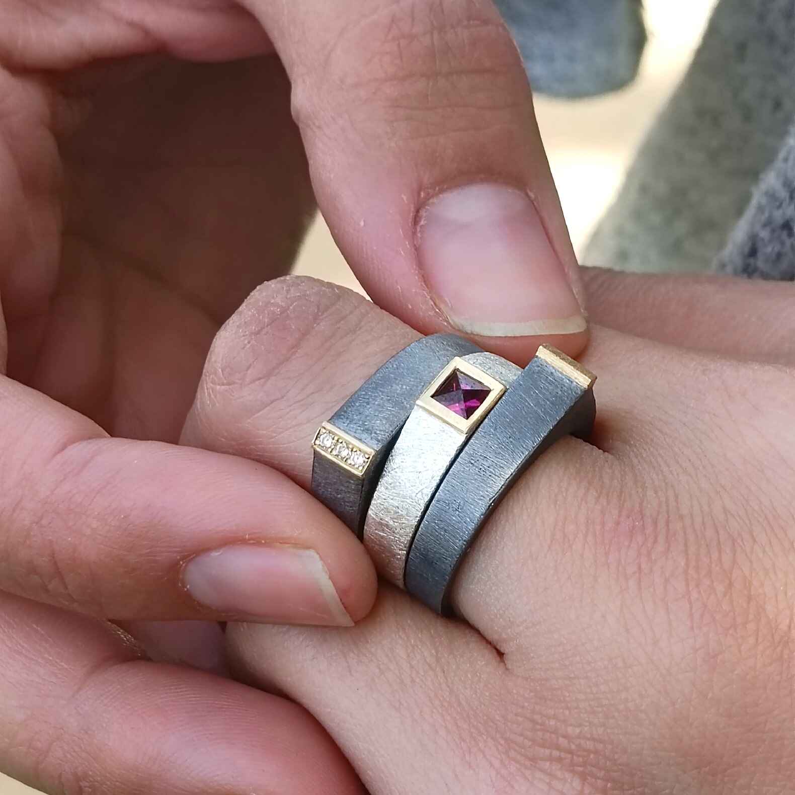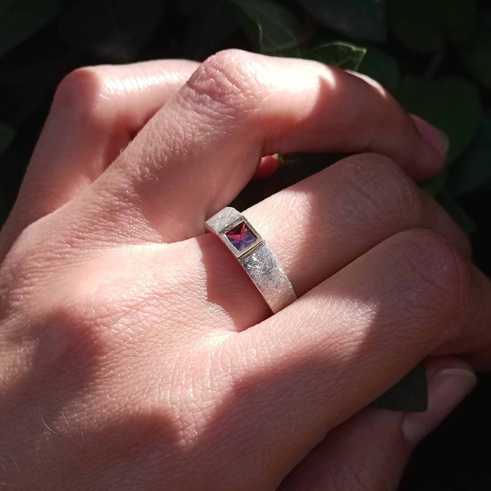 Anell de plata, or groc de 18q i un rodolito.