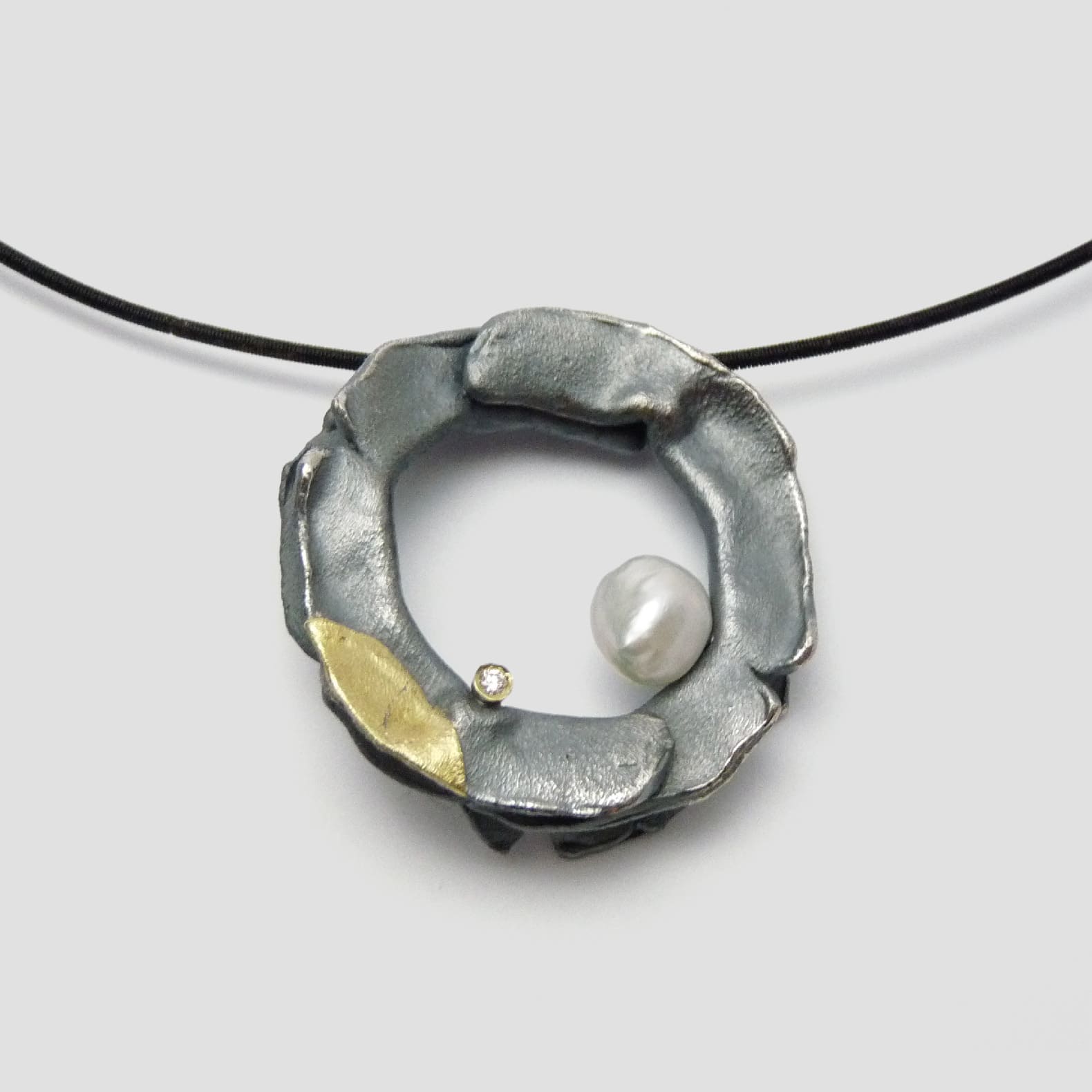 Penjoll de plata, or groc de 18q, un diamant natural talla brillant i una perla.
