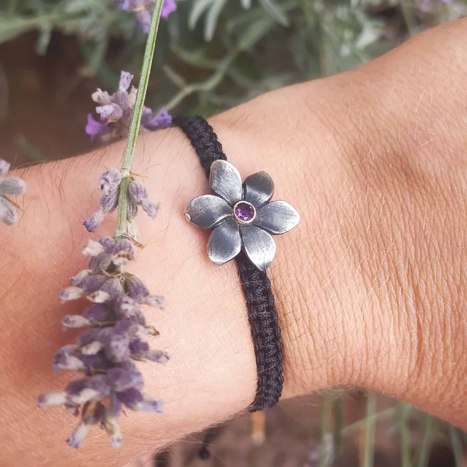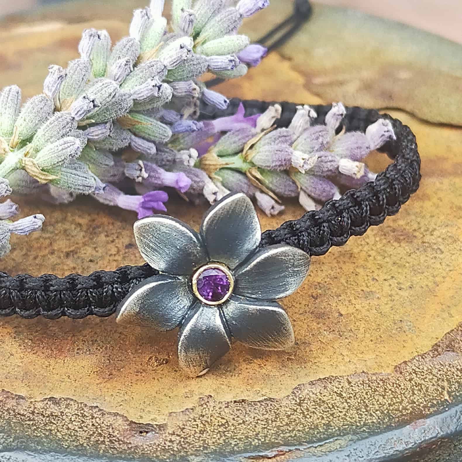 Polsera de plata, or groc de 18q, una ametista i macramé.