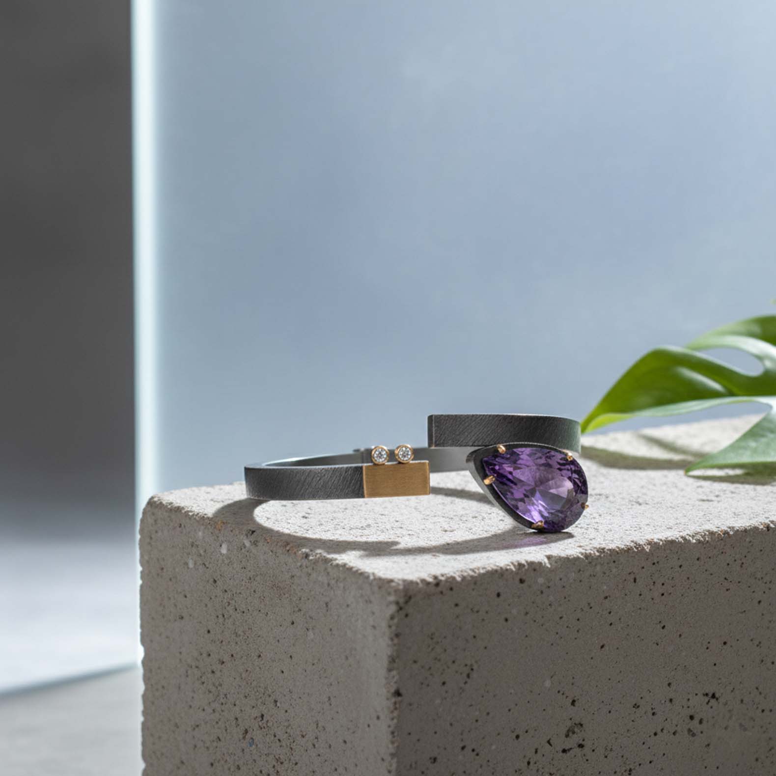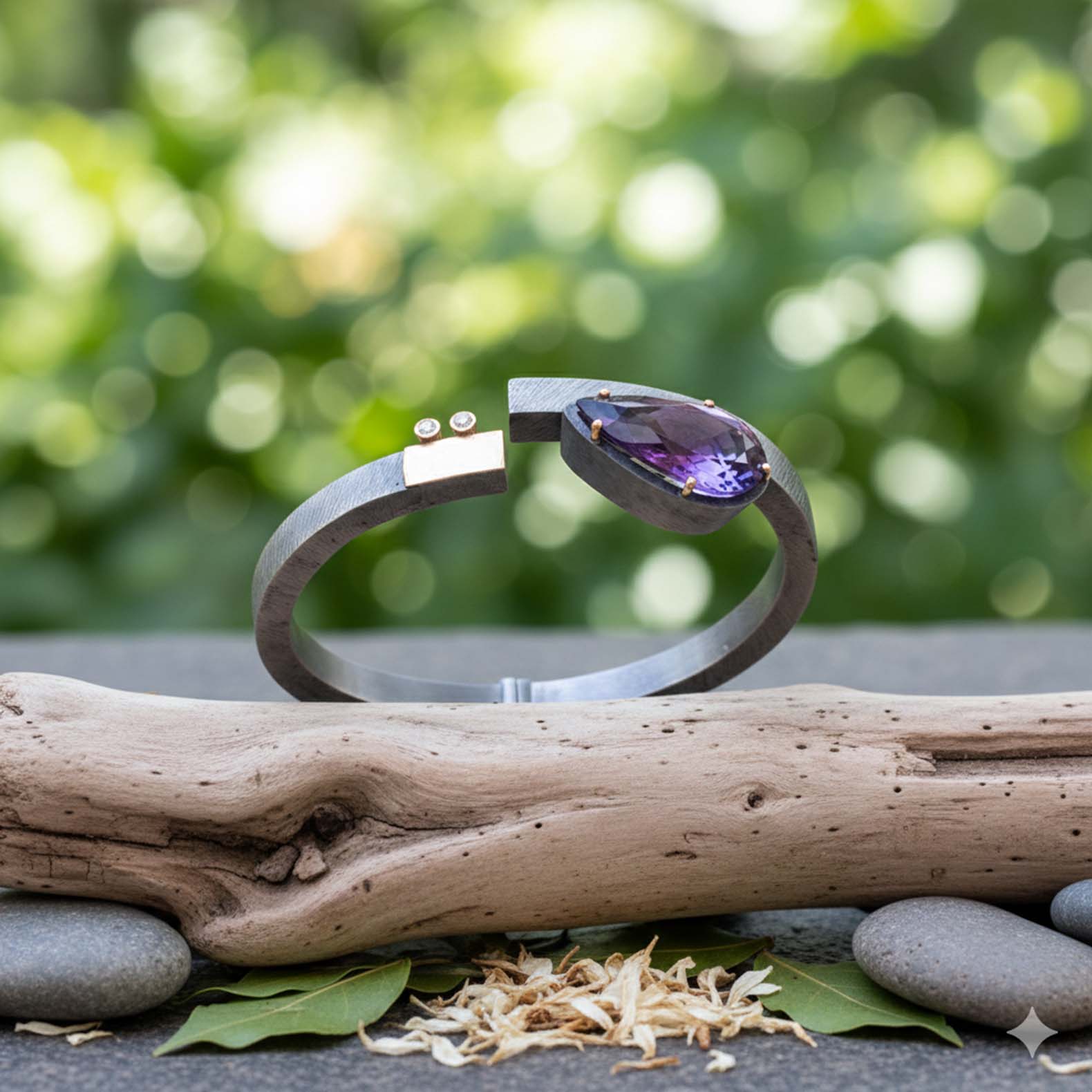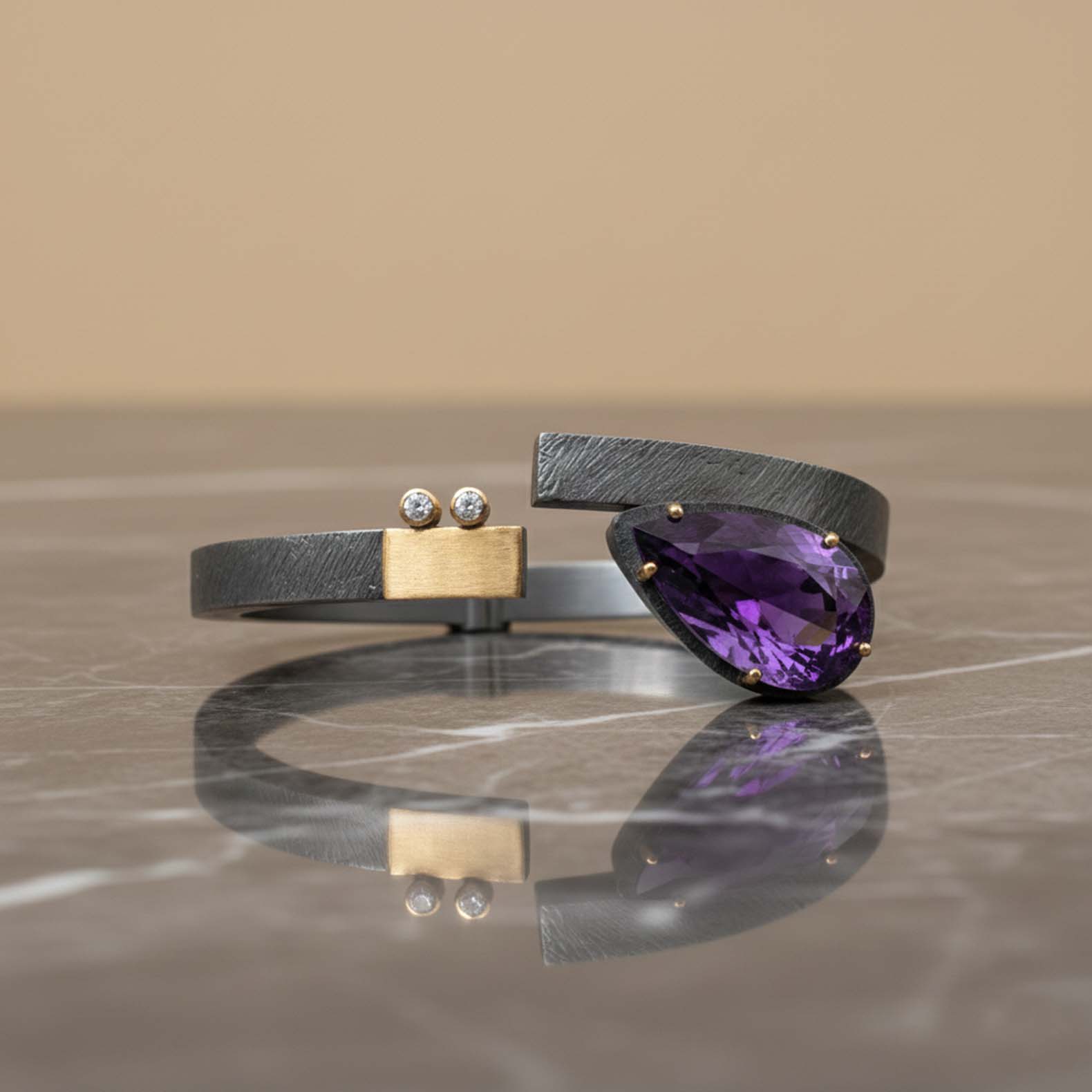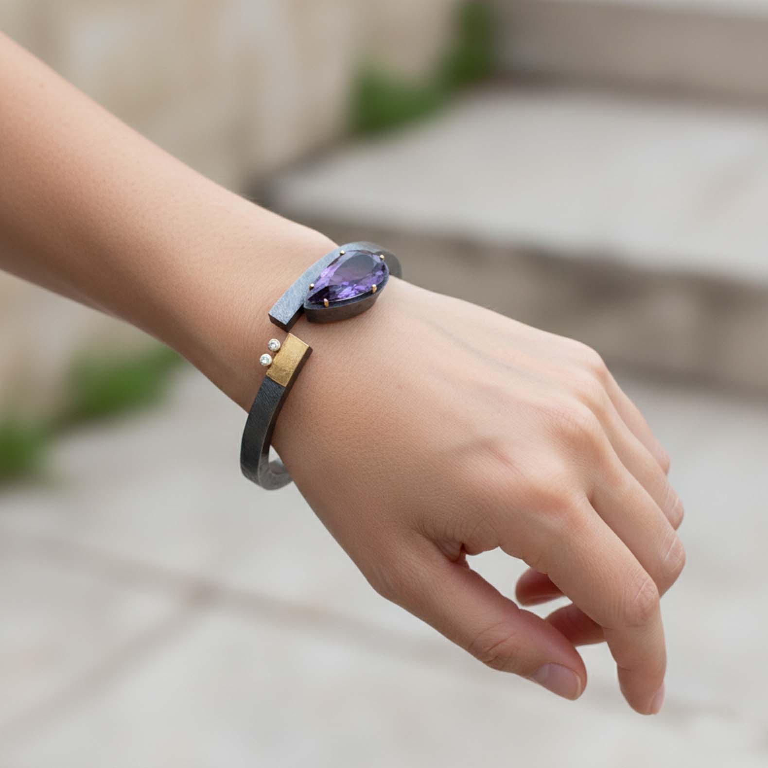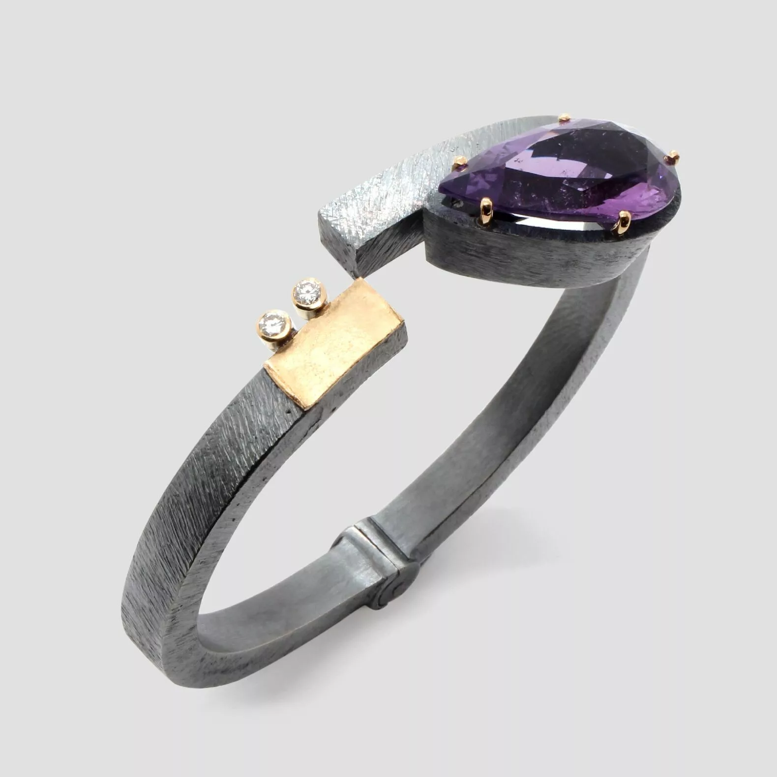 Espectacular polsera de plata i or groc de 18q amb una ametista talla perilla acompanyada de dos diamants tall brillant.