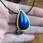 Magnífic penjoll amb una labradorita, un citrí i un diamant natural talla brillant acabat en plata i or groc de 18q.