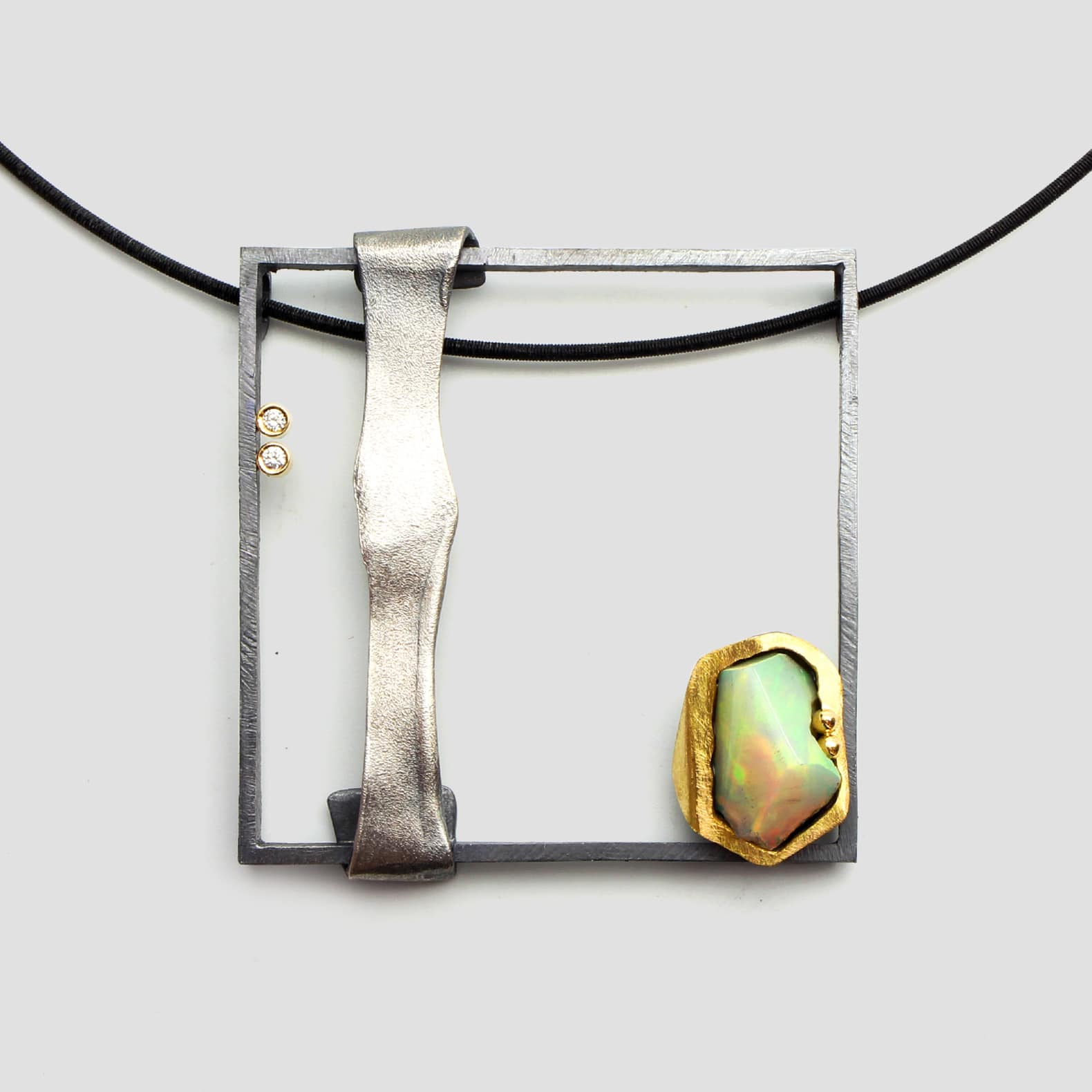 Penjoll amb un òpal etíop, de plata i or amb dos diamants naturals talla brillant. Una peça única en què contrasten les línies sòbries amb les orgàniques de l’òpal.