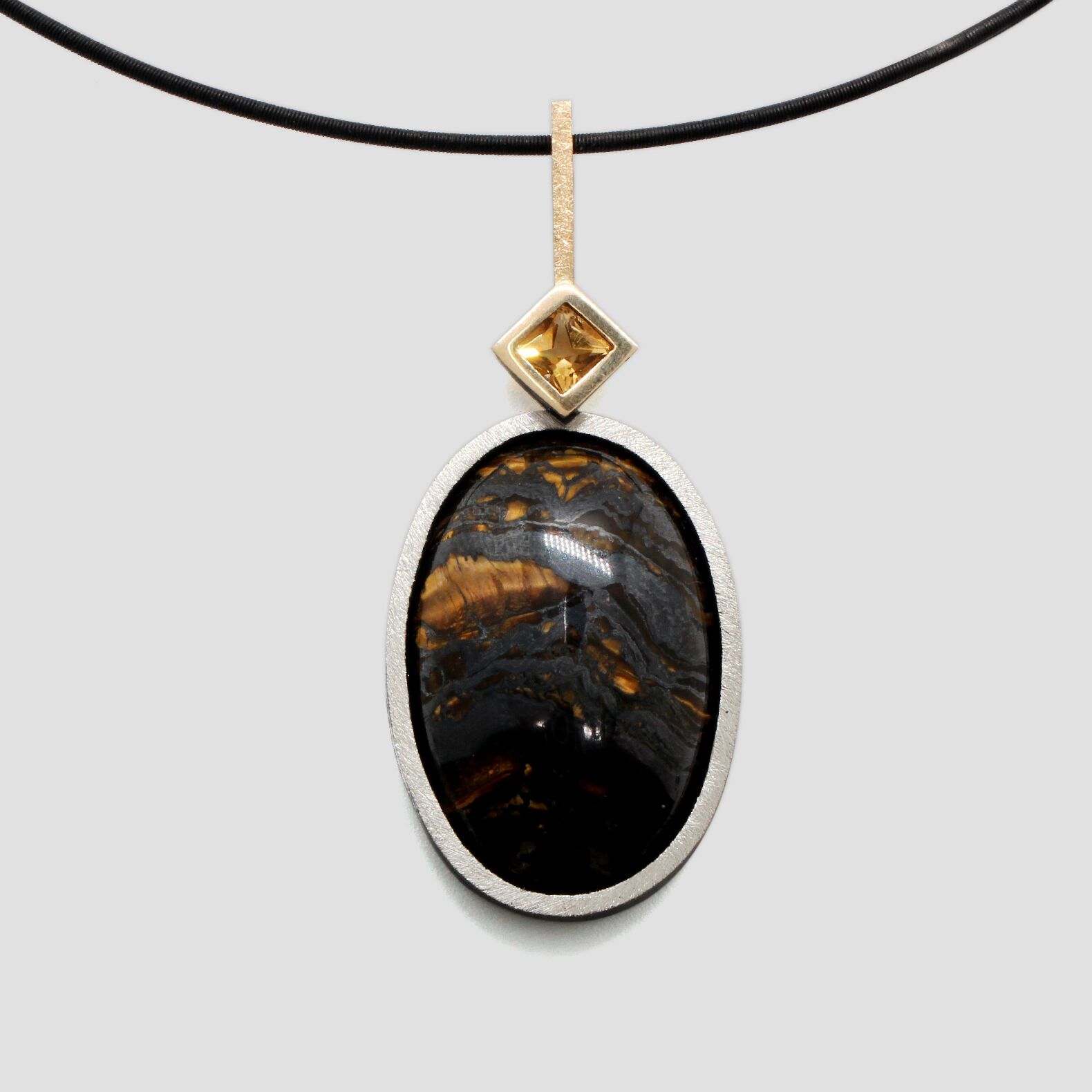 Magnífic penjoll amb un ull de tigre amb ferro i un citrí acabat en plata i or groc de 18q.