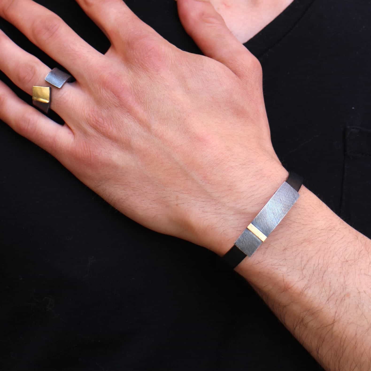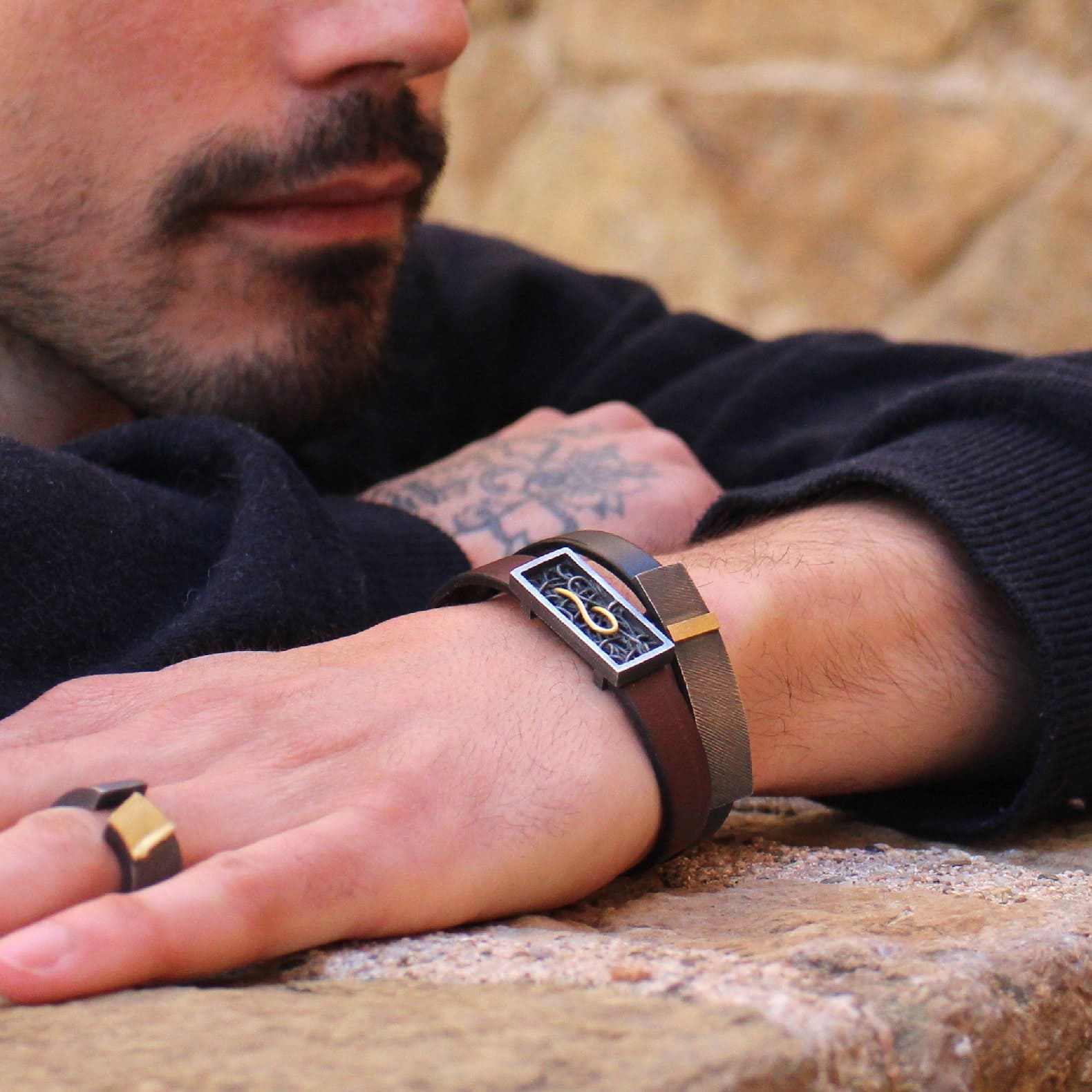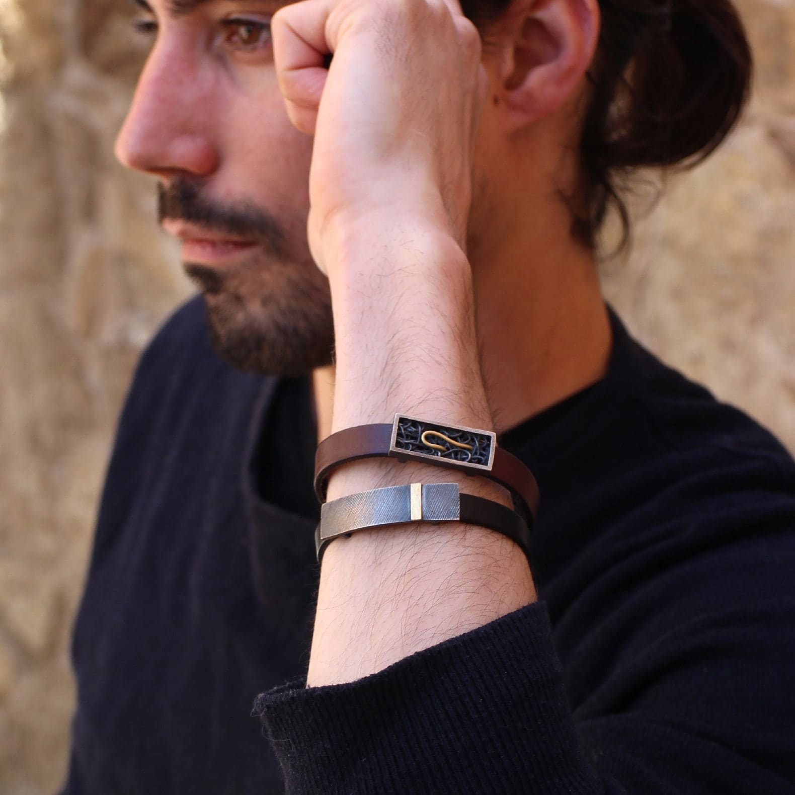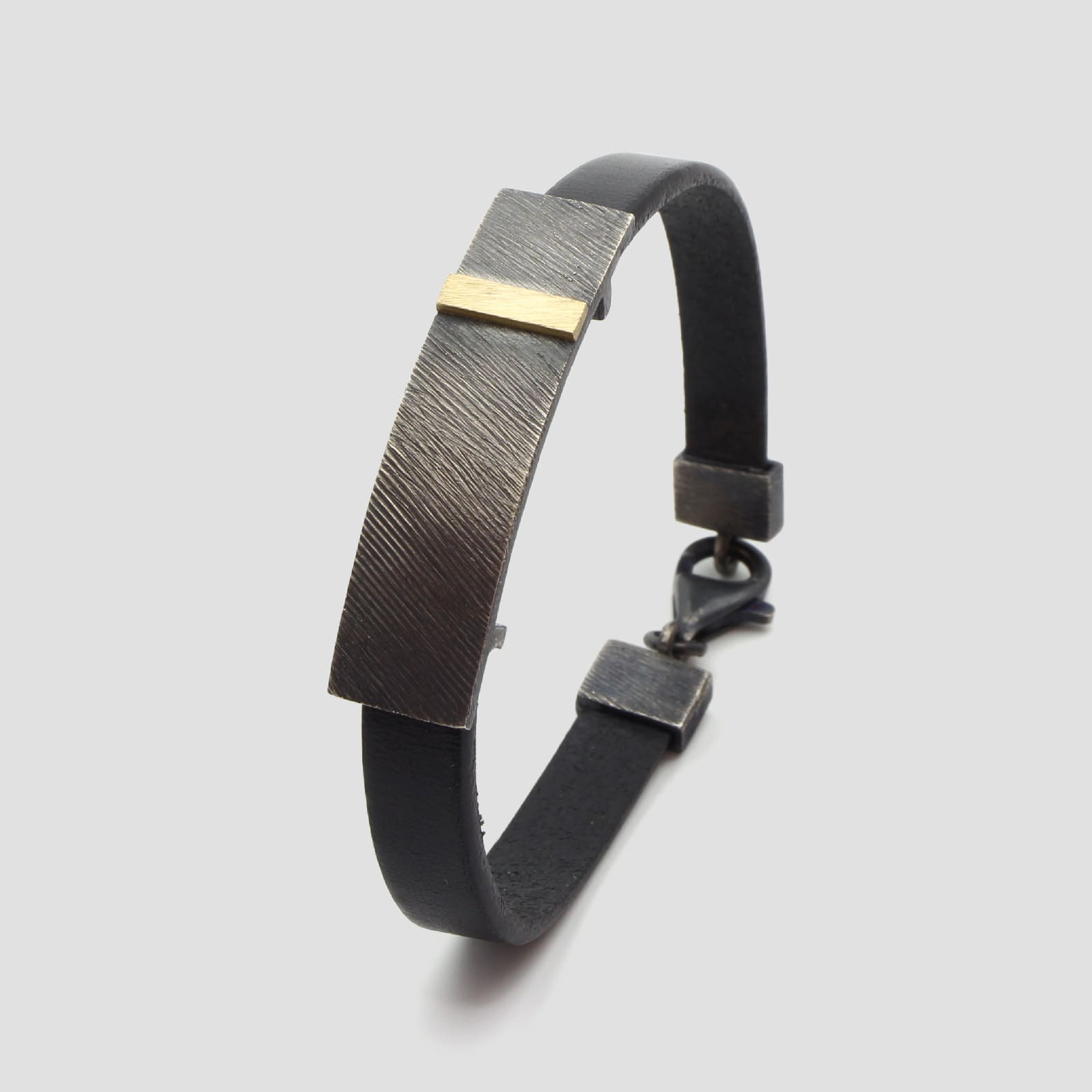 Elegant polsera per a home de plata, or groc de 18q i cuir.
