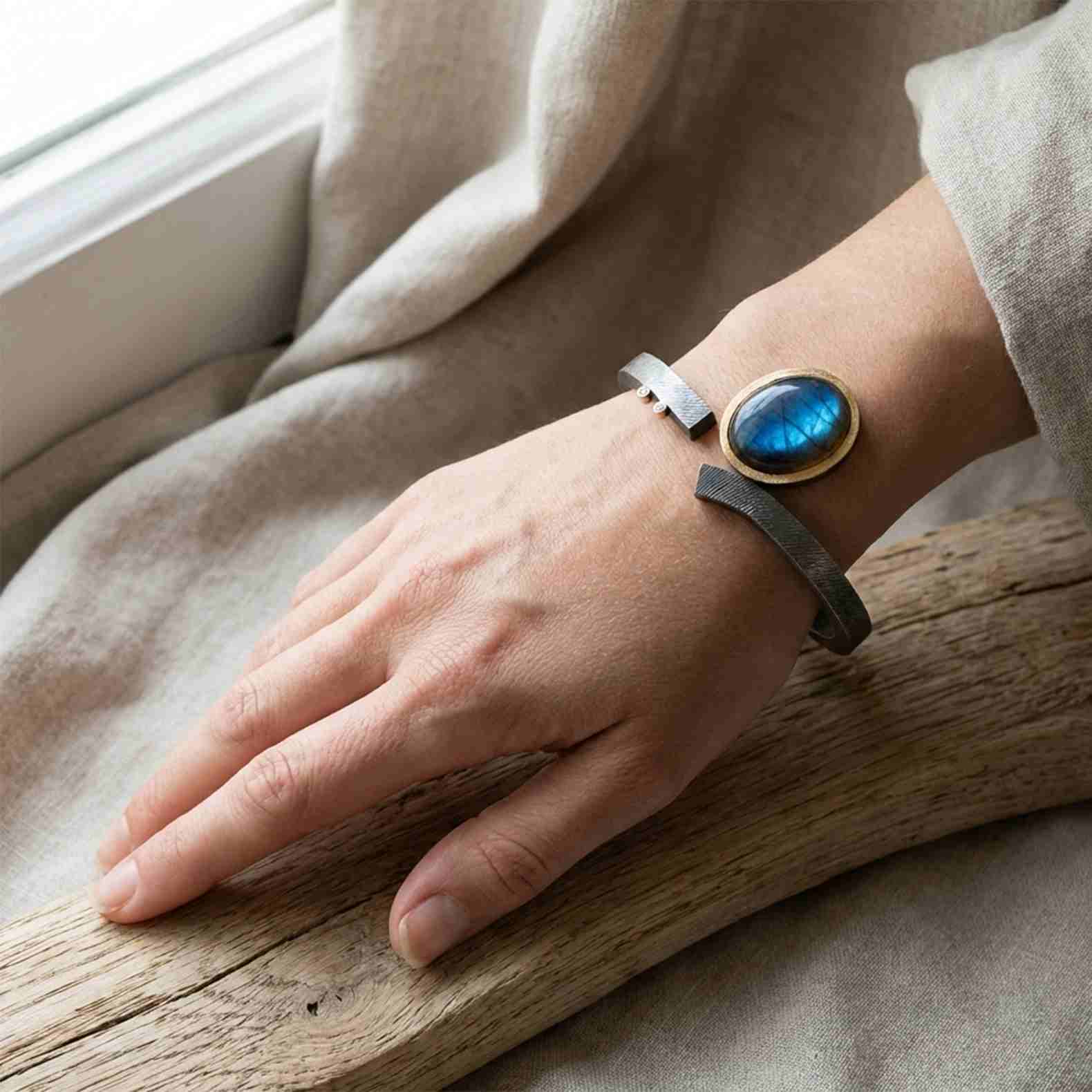 Espectacular polsera de plata i or groc de 18q amb una labradorita acompanyada de dos diamants tall brillant..